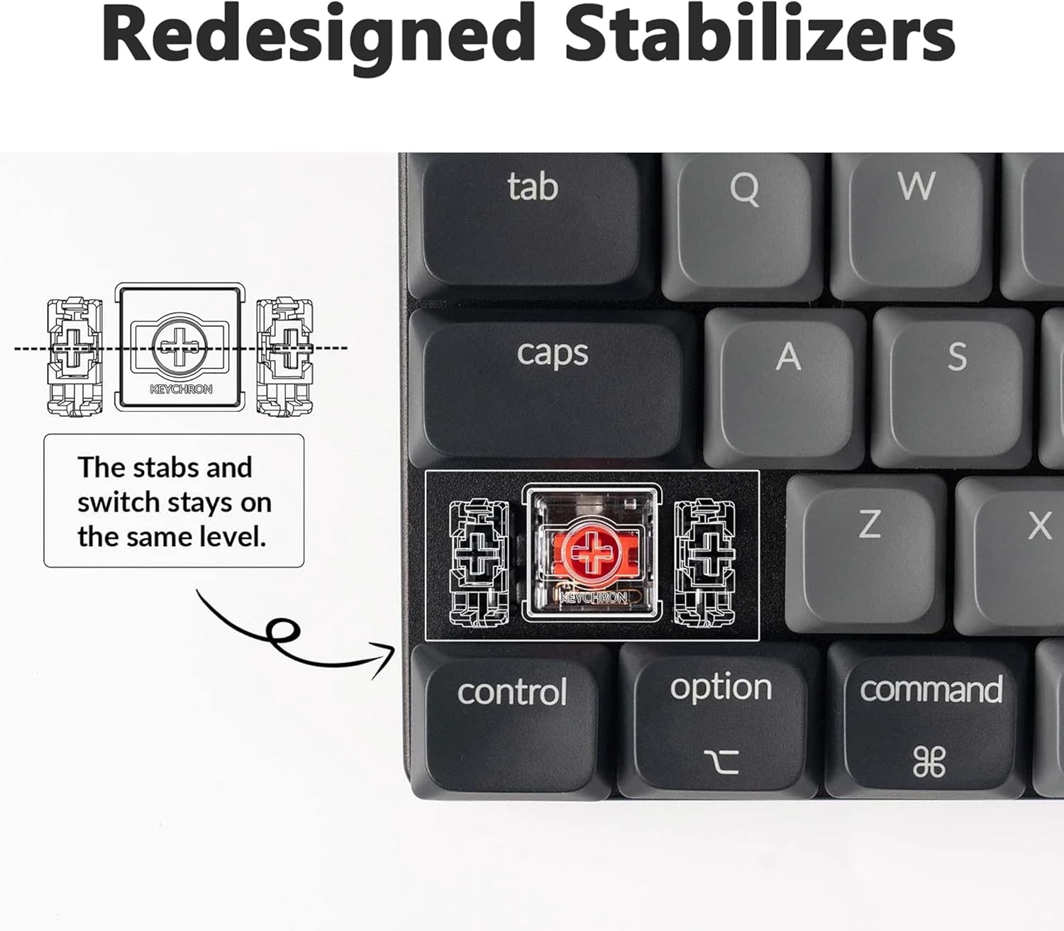 We’ve redesigned the stabilizers to make it stay on the level the same way as the switch while making sure it still delivers reliability and less wobble on the big keys like the space bar, left Shift, backspace, and Enter key.
