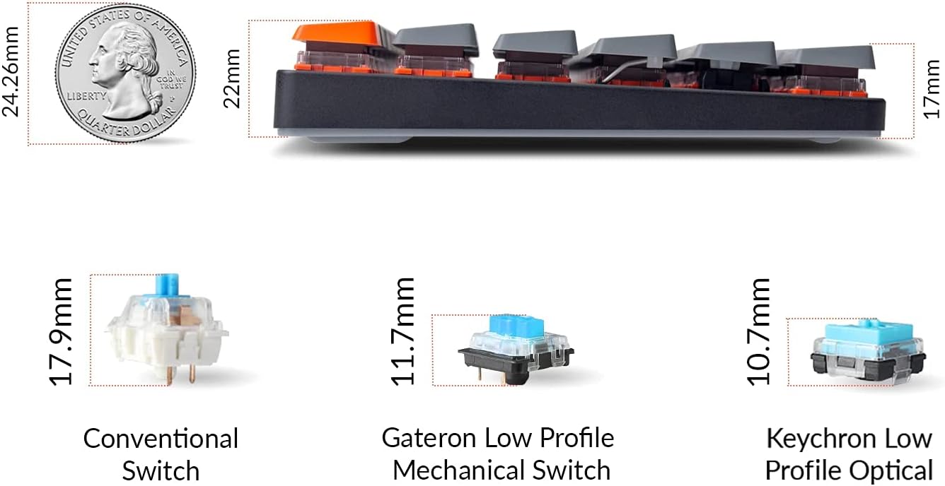 The redesigned low-profile keychron optical switch is 40% slimmer than conventional switches with a shorter pre-travel and total travel distance that triggers an input and feedback faster than conventional/normal-profile mechanical switches.
