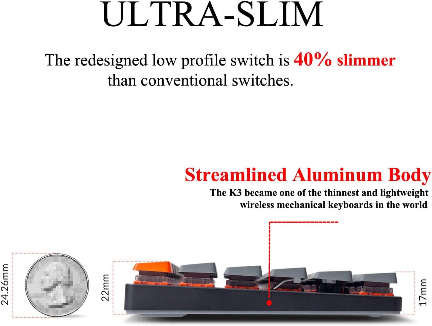 ✅【Wide Compatibility & Rechargeable Battery】: Compatible for both macOS and Windows. With a unique Mac layout, the K3 has all the necessary Mac multimedia keys while still being compatible with Windows. Extra keycaps for both Windows and Mac operating systems are included. Built-in 1550 mAh rechargeable li-polymer battery. Up to 34 Hours working time for your outdoor working.