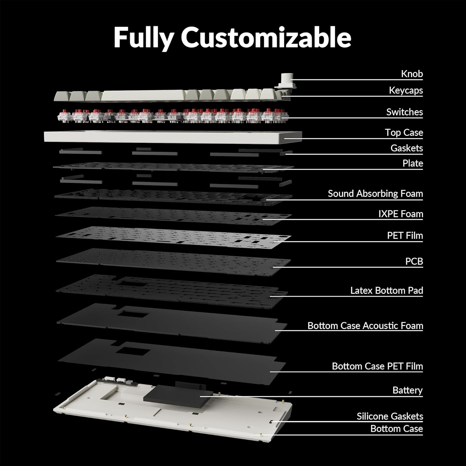 Easy Assemble - Designed every component to be able to assemble easily so you can customize and adjust each component, the PCB-mounted screw-in stabilizers for a smoother typing experience with less wobbliness on the big keys such as the space bar, shift, enter, and delete keys. You can even customize your favorite stabilizers on your own.