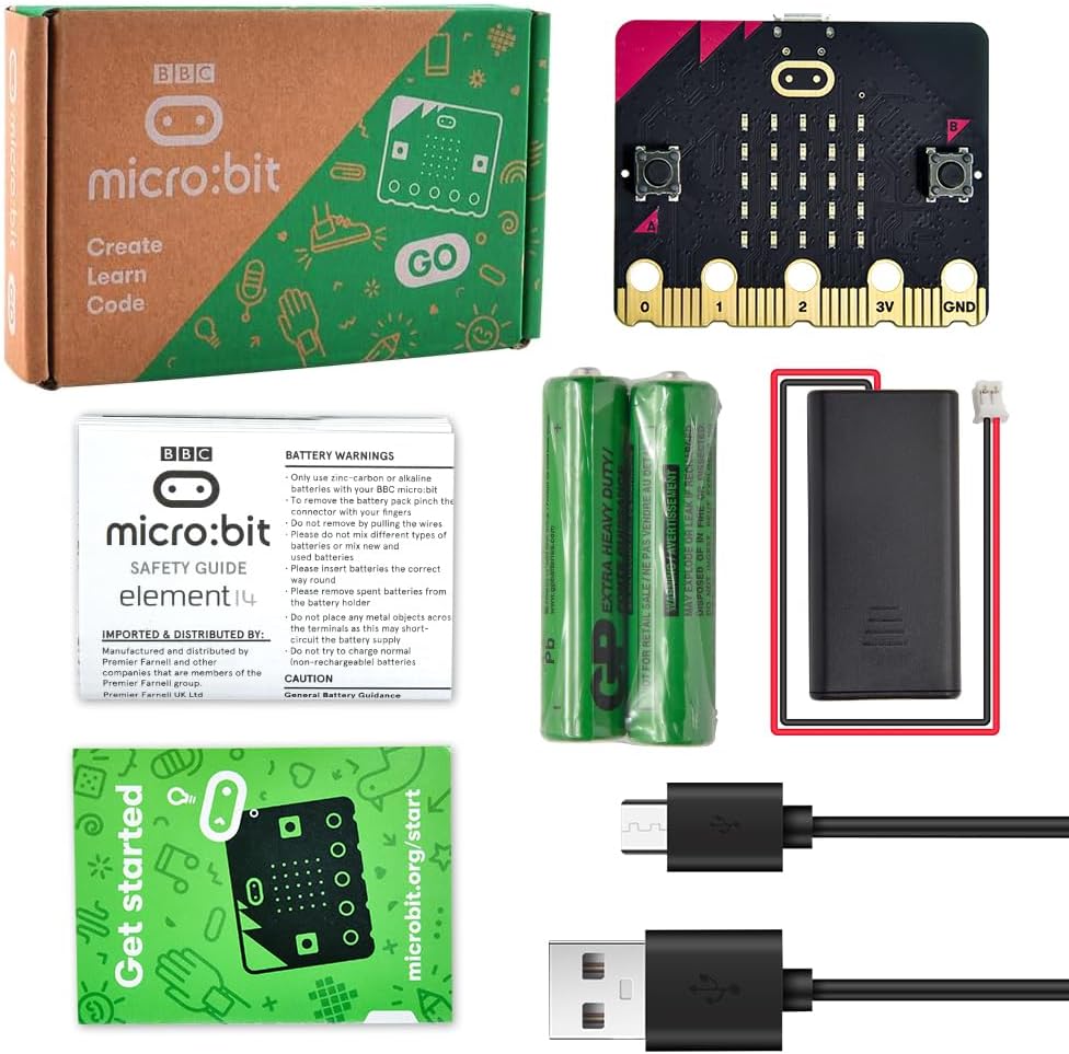Box Includes: 1 x official micro:bit v2.2 Board, 1 x micro USB Cable, 1 x Battery Holder, 2 x AAA Batteries, 1x Quick Start Guide
