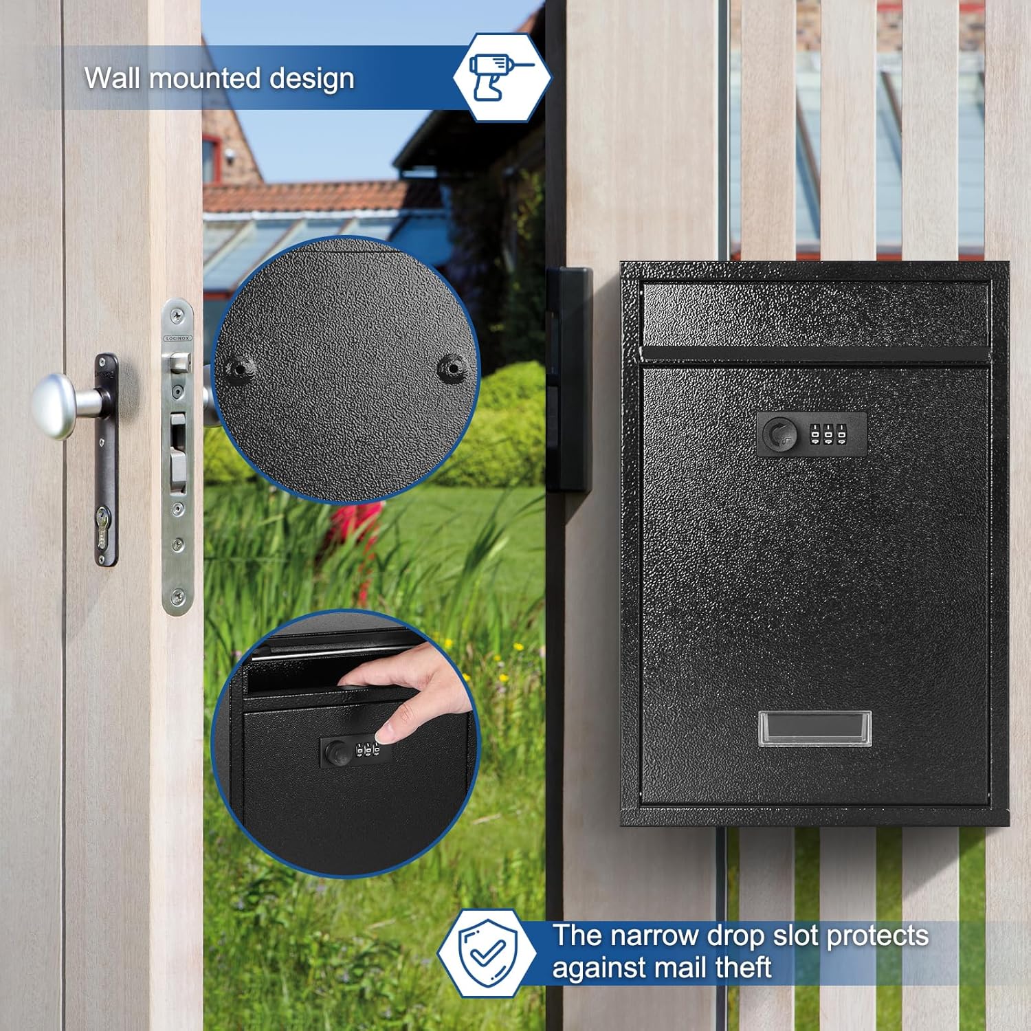 Secure Design: The lockable wall mount mailbox is made of a strong metal, 3 digital combination lock with over possible 1,000 combination code. It gives faster and more immediate access. Also you can resetting the code whenever