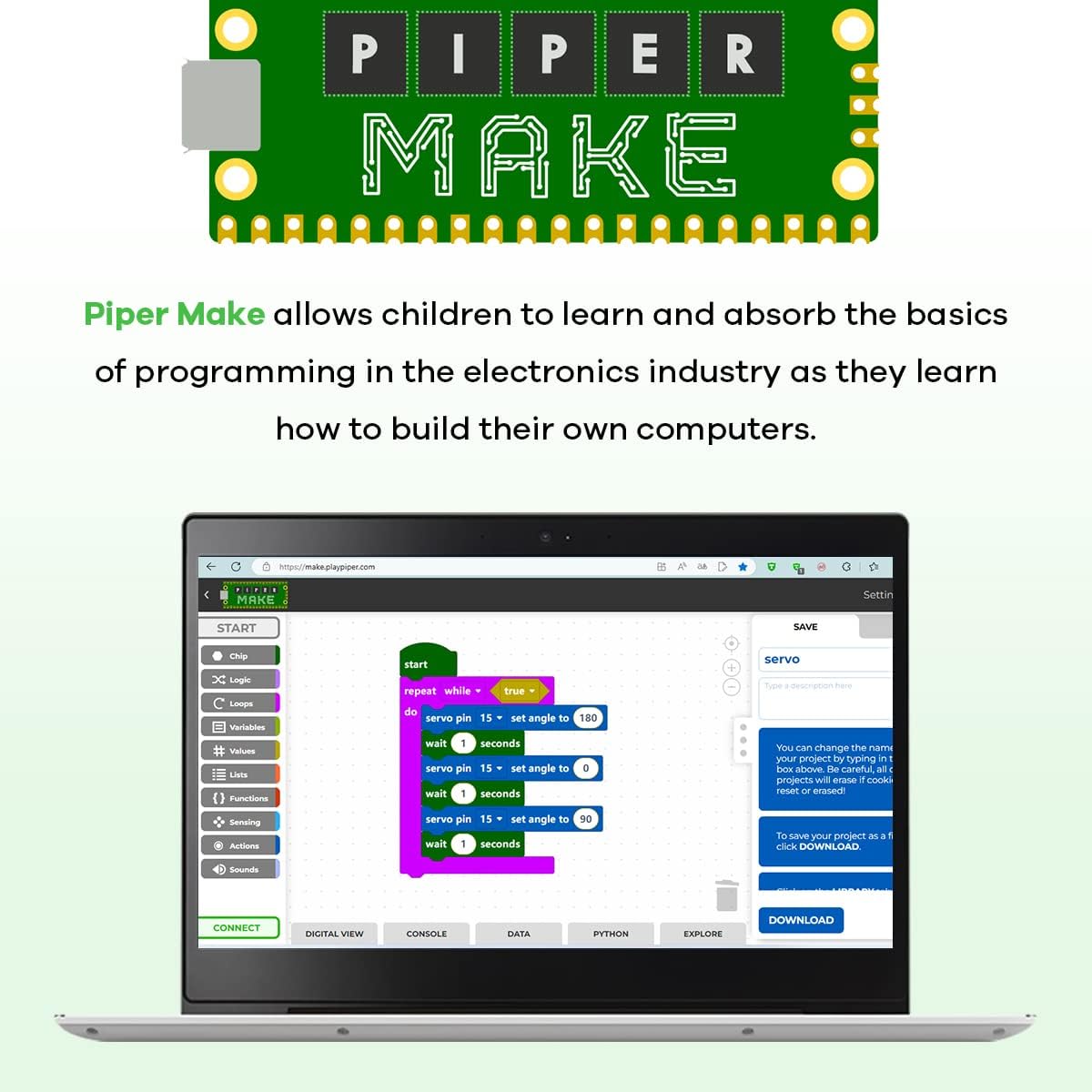 Piper Make allows children to learn and absorb the basicsof programming in the electronics industry as they learnhow to build their own computers.