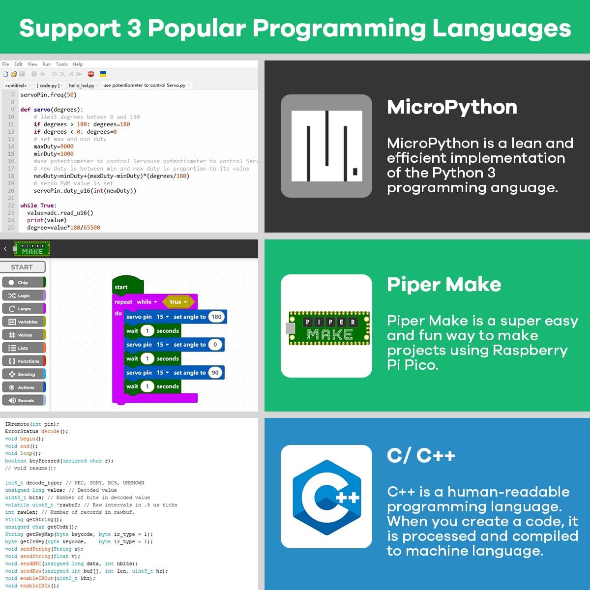Support 3 languages MicroPython, C and Piper Make.