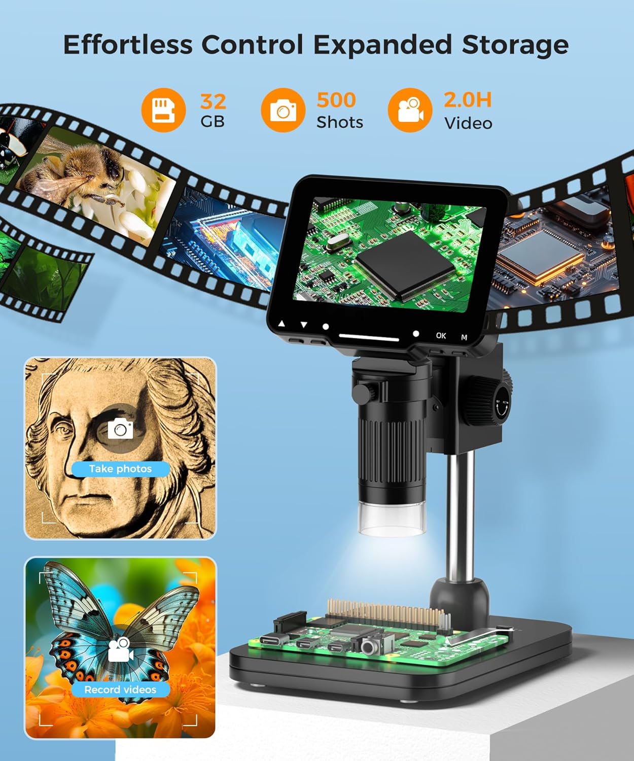 【4.3-Inch High-Definition LCD Screen and 32GB Card】4.3-inch screen microscope can capture a clear detailed view of the object in a certain area of the picture and record video, and record a clear micro-world experience, The images and videos obtained during the observation process are saved in a 32GB SD micro card (Included 32microSD card).