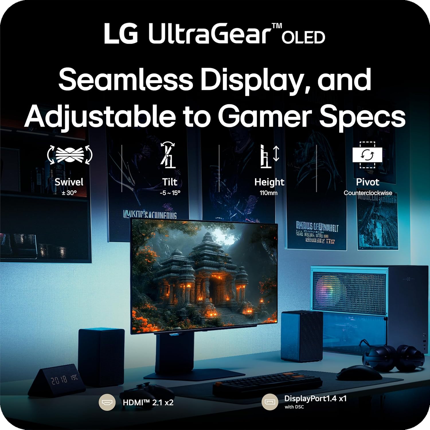 When speed is critical, dominate with a 280Hz refresh rate¹, 0.03ms response time, G-SYNC Compatibility, FreeSync Premium Pro, and VESA ClearMR 13000 for blur-free, tear-free gaming. HDMI 2.3 and DisplayPort 1.4 keep you connected to the latest PC and console hardware. Complete with DTS Headphone:X support, LED backlighting, and a height, tilt, swivel and pivot adjustable stand—this is UltraGear OLED gaming, perfected.