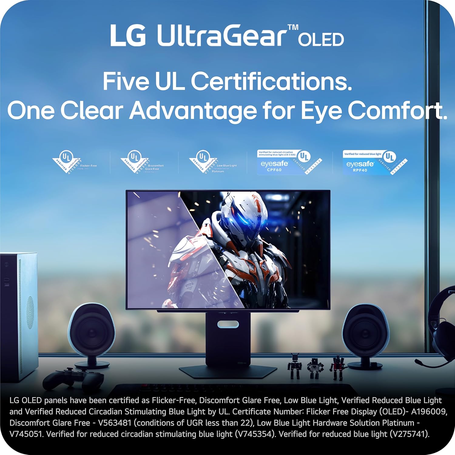 Five UL Certifications. One Clear Advantage for Eye Comfort. - This UltraGear OLED display is five times UL-certified—for Anti-Glare, Flicker-Free, Low Blue Light, Reduced Blue Light, and Reduced Circadian Stimulating Blue Light. Combined with a matte anti-glare finish, the display helps reduce distractions, keep your view crisp, and maintain visual comfort—so you can stay focused and perform at your best, even during extended gaming sessions.