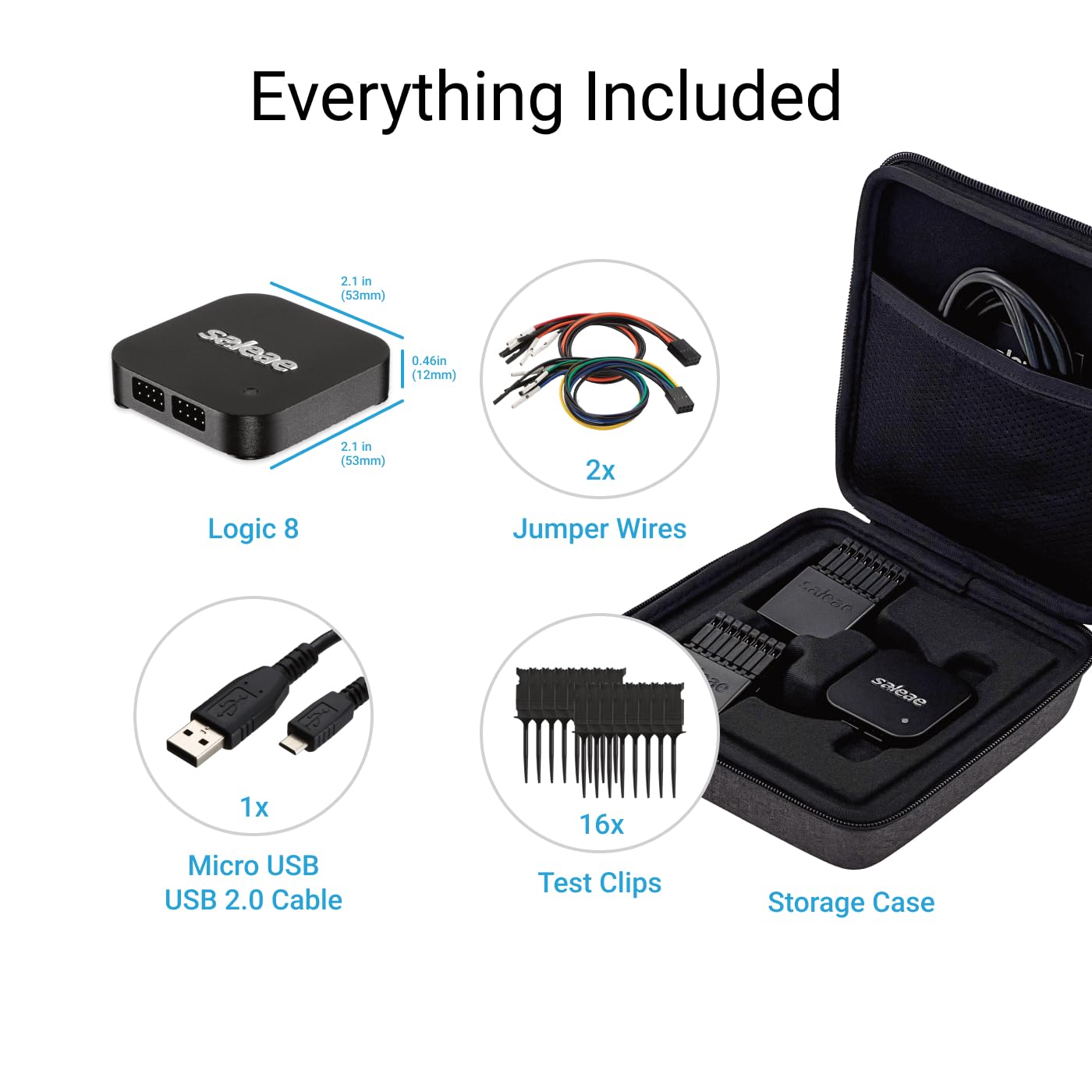 A: Logic comes with everything you need, including a case, USB cable, wire harnesses, and test clips.