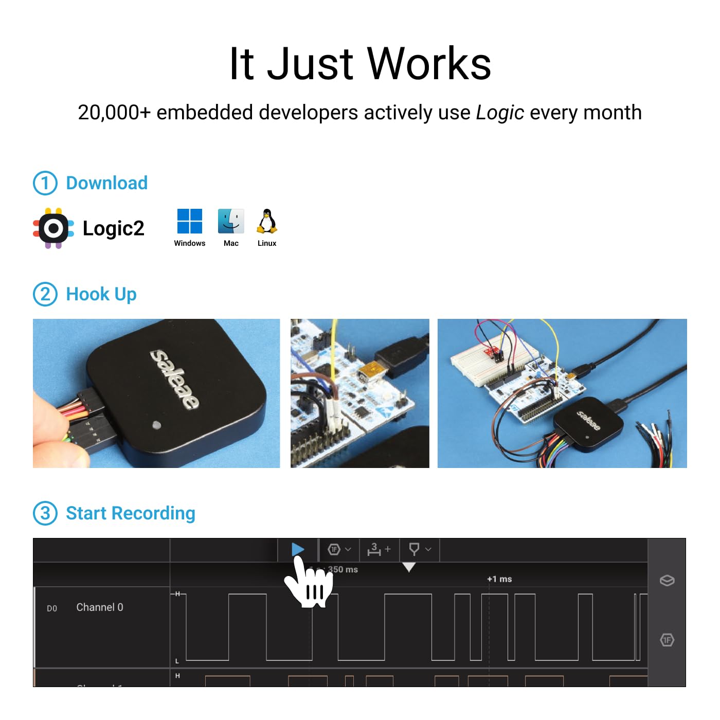 Download Software: Try the software for free to explore all features.All-Inclusive Package: The Logic 8 includes all necessary accessories for immediate use.Comprehensive Protocol Support: Extensive protocol list ensures compatibility with a wide range of devices and systems. Cross-Platform Compatibility: Works seamlessly across major operating systems.The Saleae Logic 8 is your go-to tool for efficient and thorough debugging of electrical circuits, whether you’re a hobbyist or a professional.