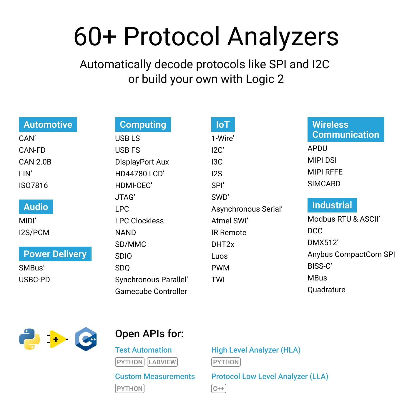 A: Over 60 protocols are supported by Saleae and the community. Built-in protocols include: