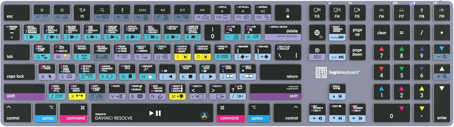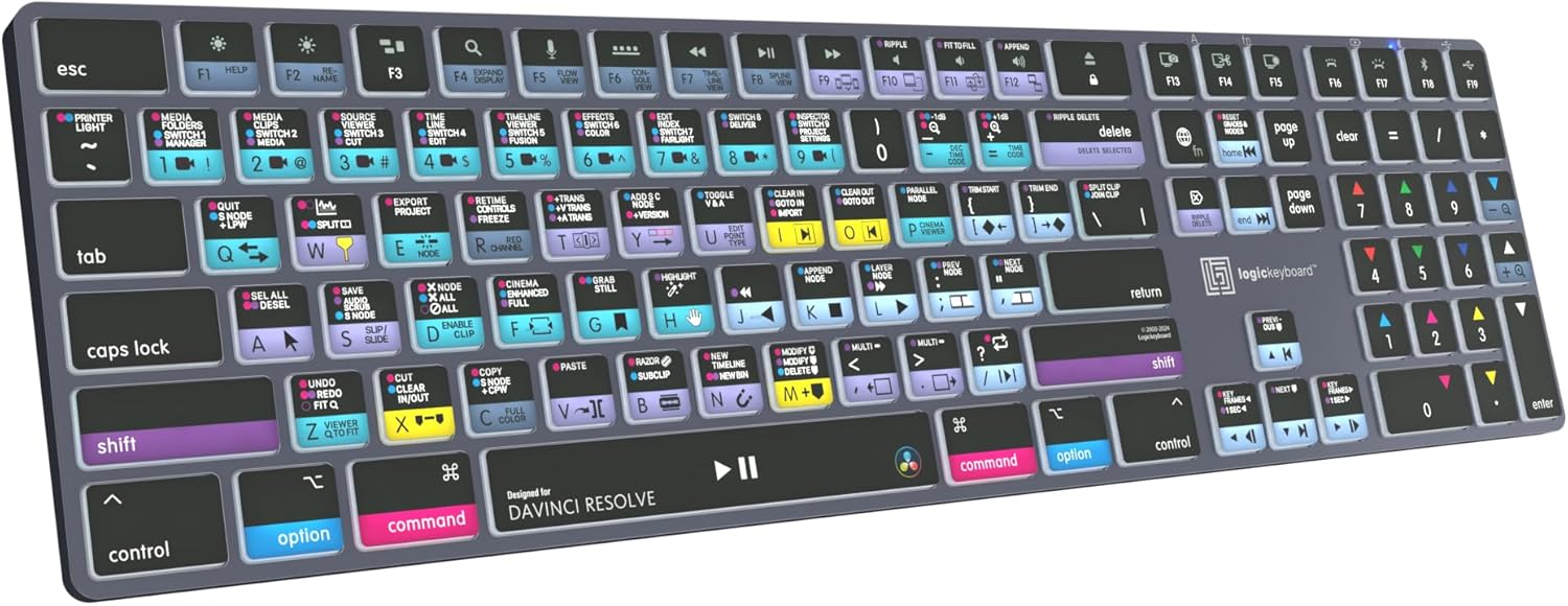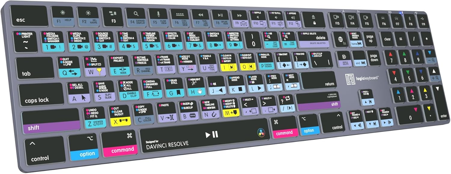 Elevate your Blackmagic editing setup with the new 'Titan' Logickeyboard tailored for DaVinci Resolve - Skip the tedious menu navigation and save time in your DaVinci Resolve editing using the Logickeyboard's 150+ direct keyboard shortcuts, all displayed right at your fingertips