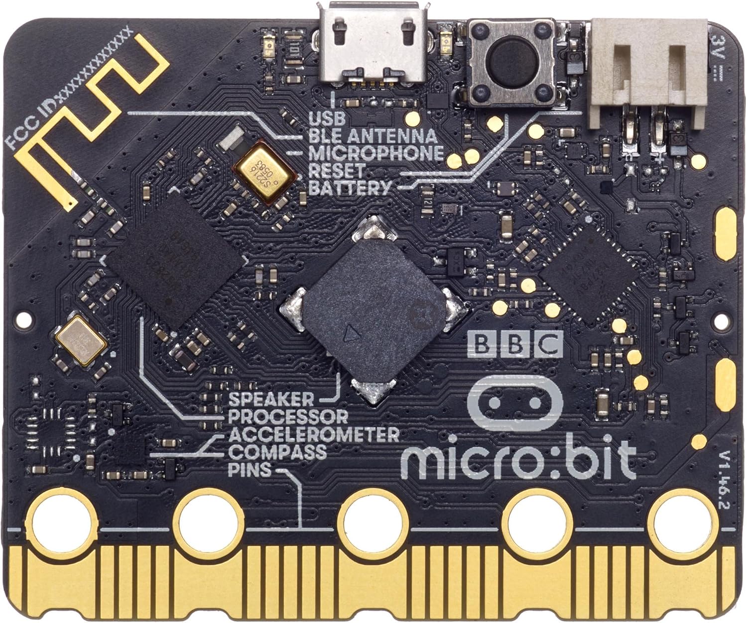 The BBC Micro:bit V2.2 is powered by the Nordic nRF52833 application processor, which houses an Arm Cortex-M4 32-bit processor with FPU. It features Bluetooth 5.1, low-level radio communications (2.4GHz, 80 channels), and a variety of sensors including: