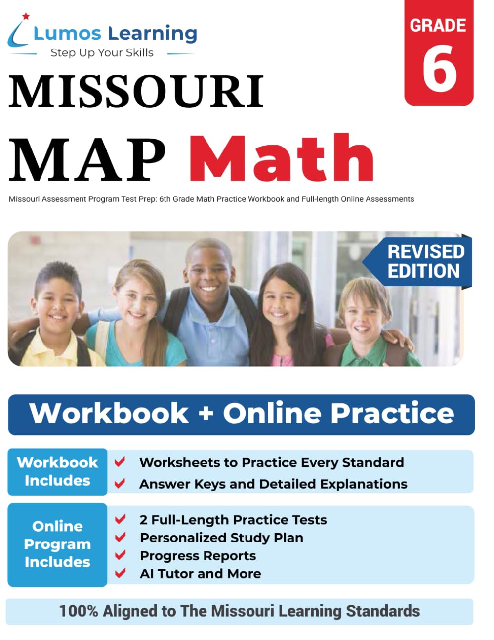 Lumos MAP 2025-26 Workbook Highlights Missouri State standards-aligned print and digital resources Coverage of 30+ Grade 6 Math skills Two online practice tests mirroring the real MAP Personalized study plans and Guided practice with AI Tutor