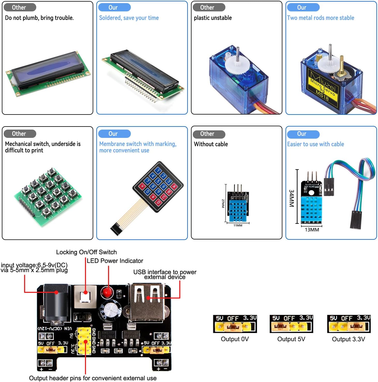 Miuzei Starter Kit Compatible with Arduino Projects with Microcontroller, LCD1602 Module, Breadboard, Power Supply, Servo, Sensors, Jumper Wires, LEDs, Detailed Tutorial MA13