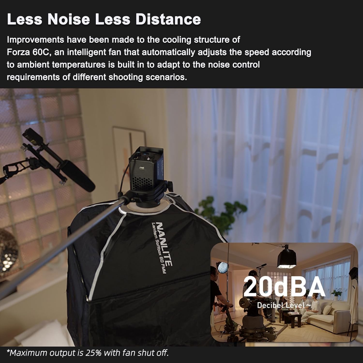Improvements have been made to the cooling structure ofForza 60C,an intelligent fan that automatically adjuststhe speed according to ambient temperatures is built in toadapt to the noise control requirements of different shootingscenarios