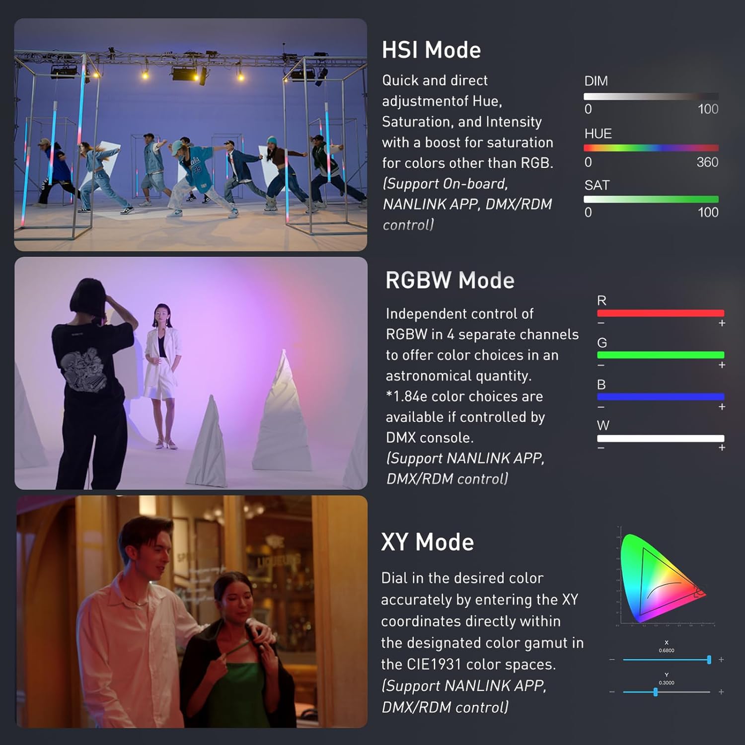 Forza 60C offersprofessional options of HSl / RGBW / XY modes for color calibration.
