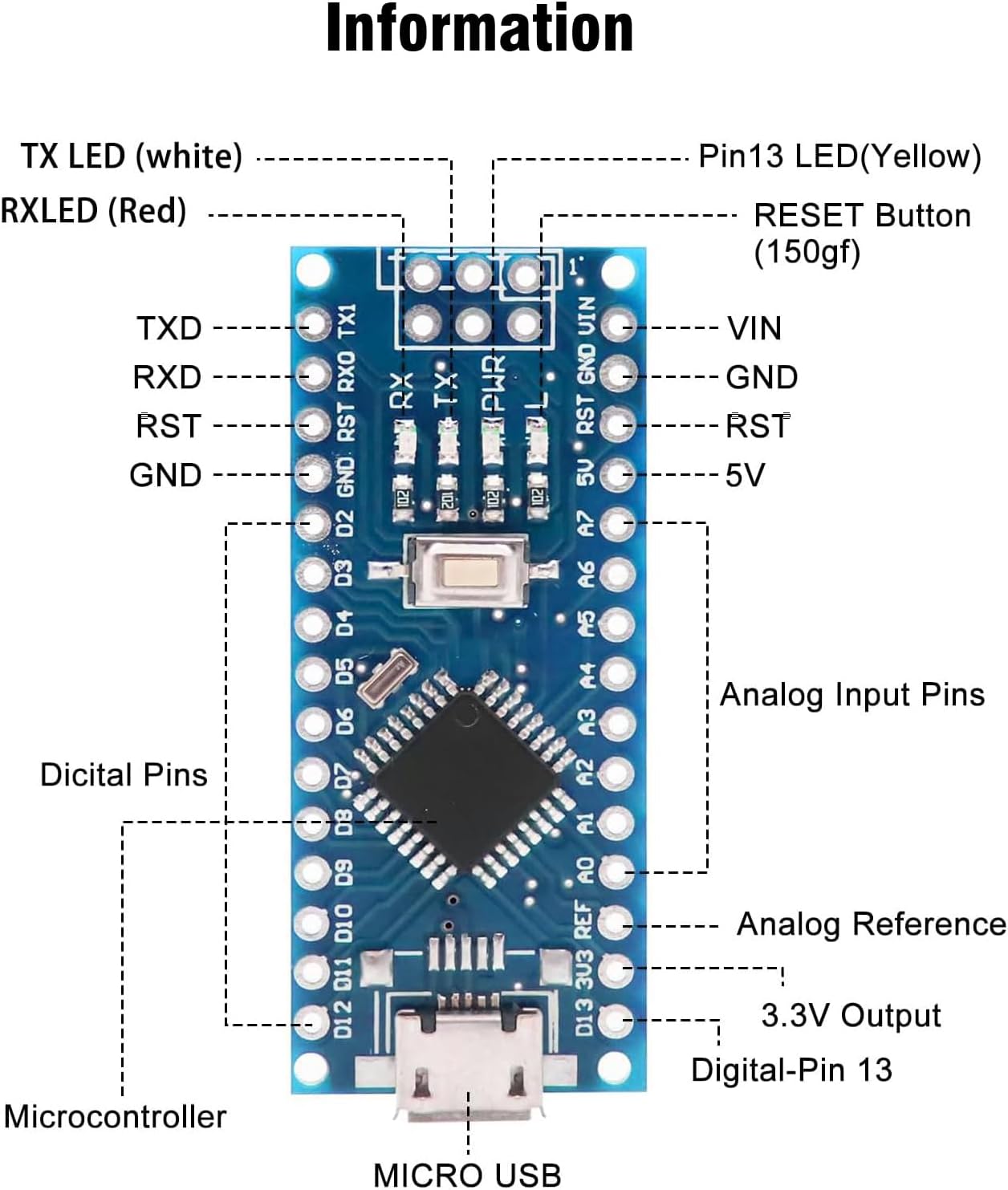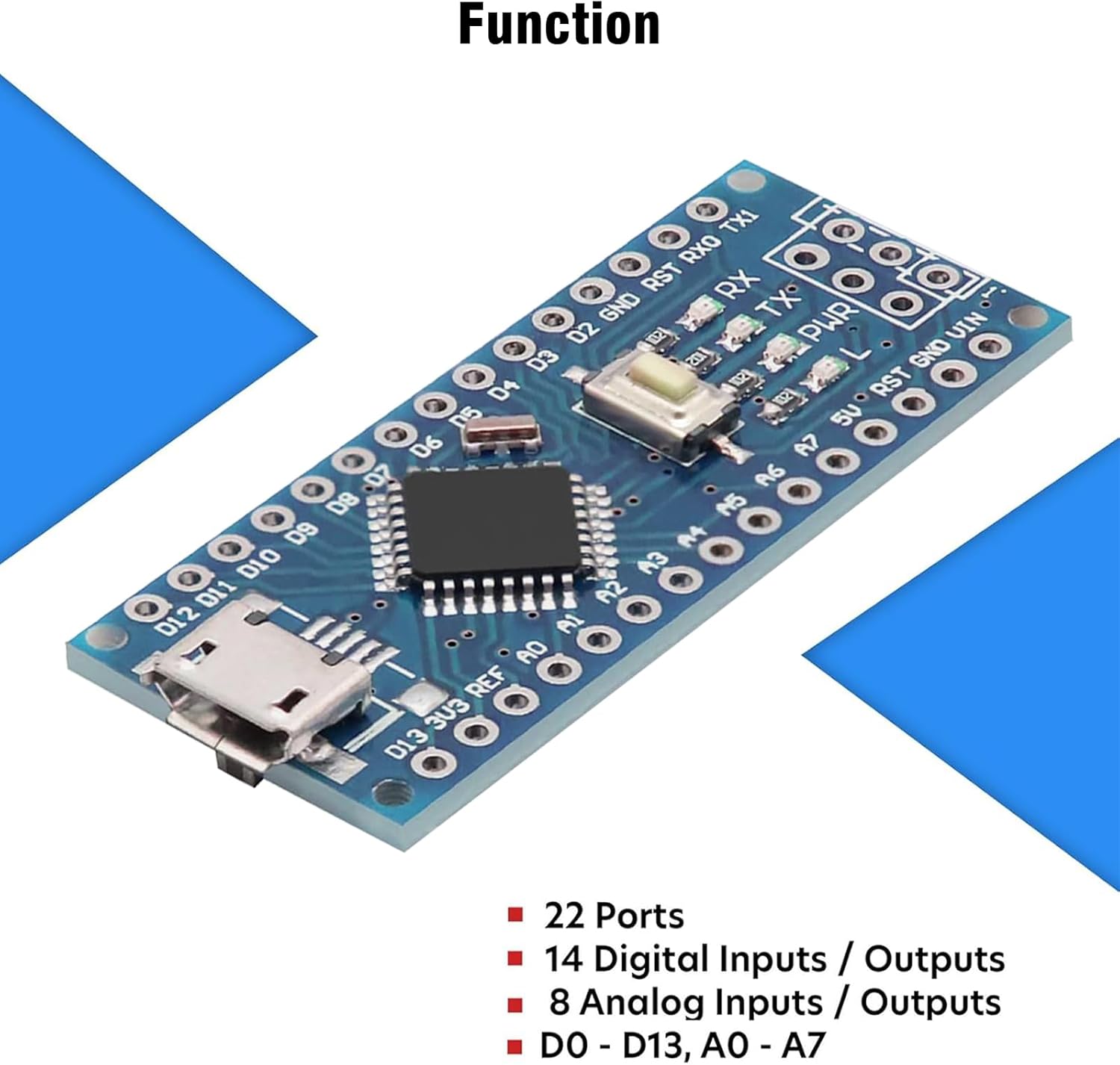 The Nano board has 14 digital I/O pins (6 of which can be used as PWM outputs), 6 analogue inputs, a 16MHz quartz oscillator, a Micro USB power socket, an ICSP port and a reset button.