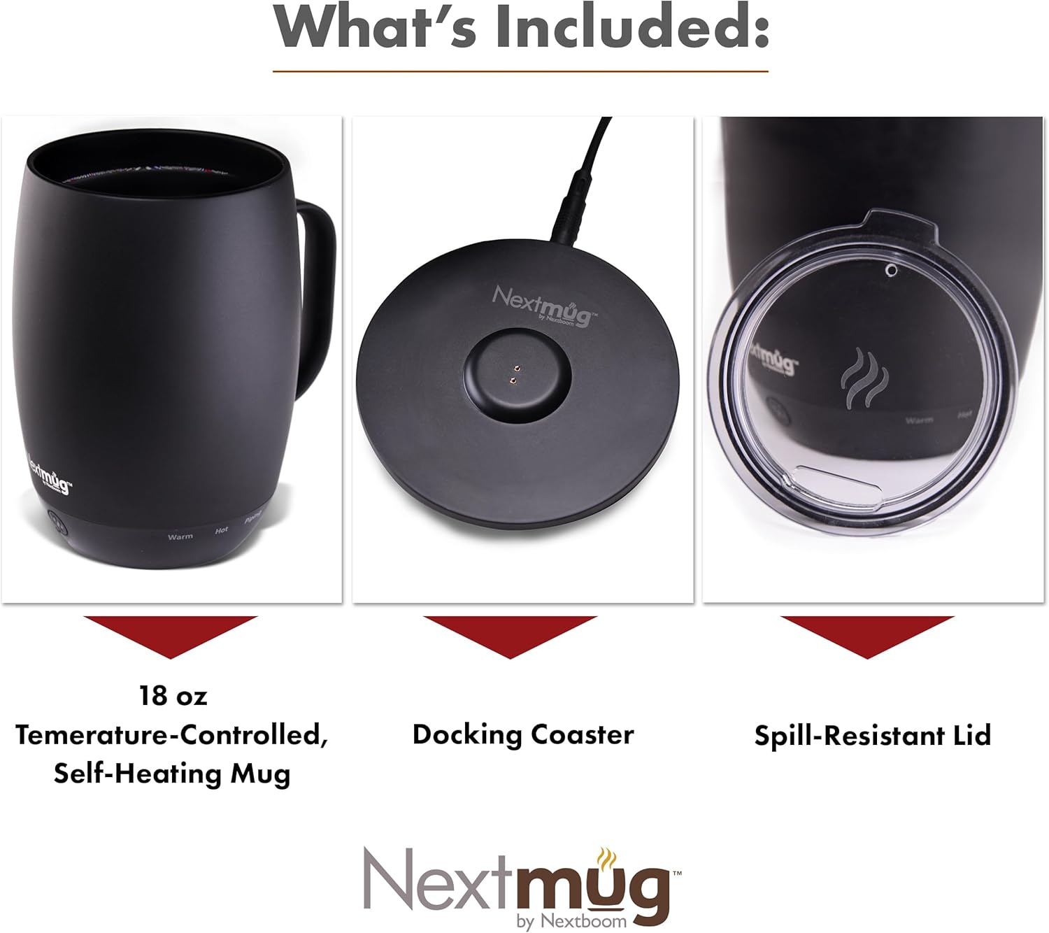WHAT'S INCLUDED – (1) 18 oz. Nextmug Plus; (2) Docking Coaster & 6-foot cord to charge the lithium-ion battery inside the Nextmug; (3) Spill-Resistant Lid to keep hot liquids in the mug and help maintain the ideal temperature for longer periods of time. All Nextmugs are fully compatible, including mugs, lids, docking coasters and accessories.