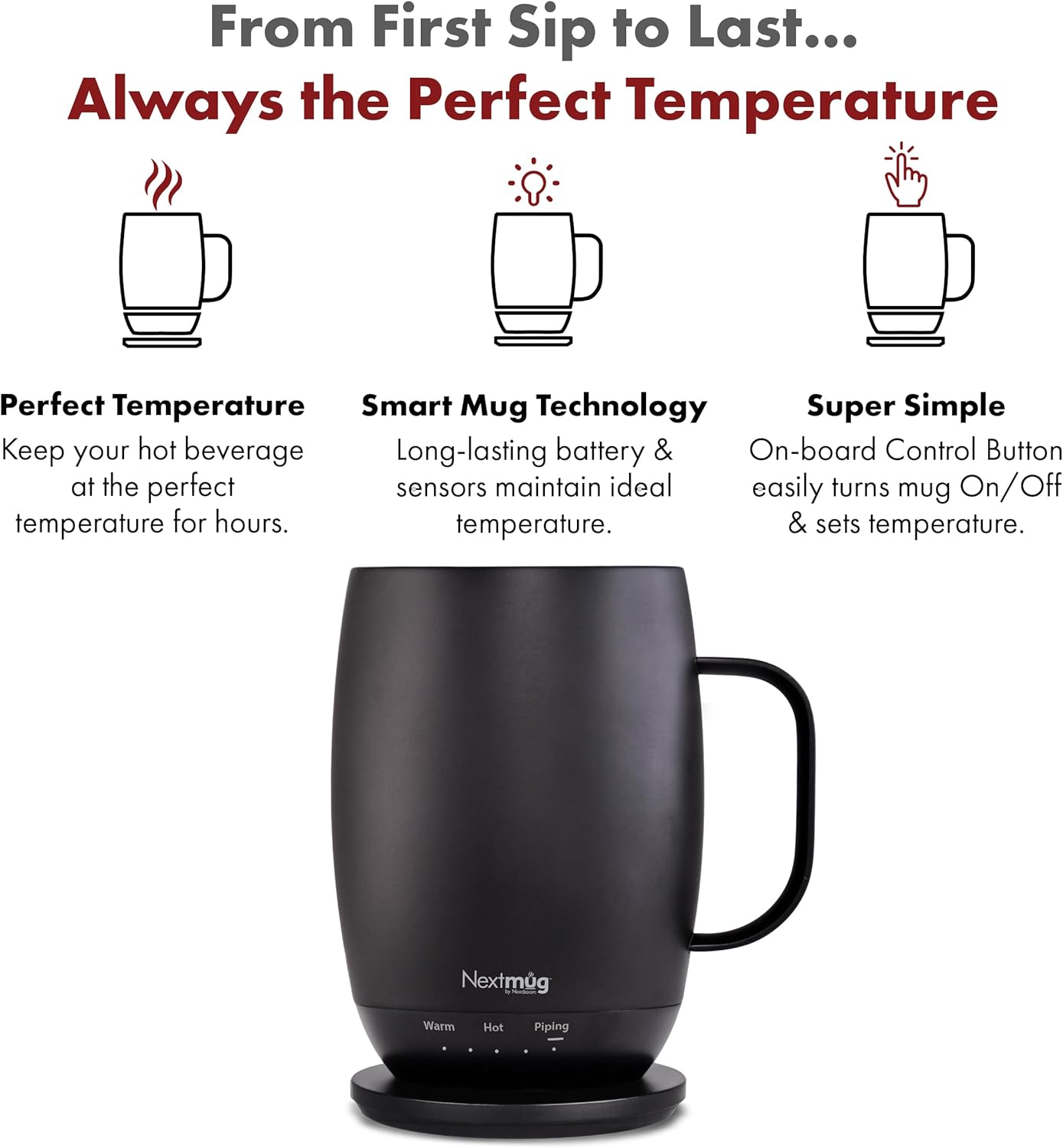 ALWAYS THE PERFECT TEMPERATURE – The Nextmug Plus will keep your hot coffee, tea or preferred beverage at the perfect temperature wherever you are. Simply select Warm (130° F), Hot (140° F), or Piping (150° F) and enjoy for hours.