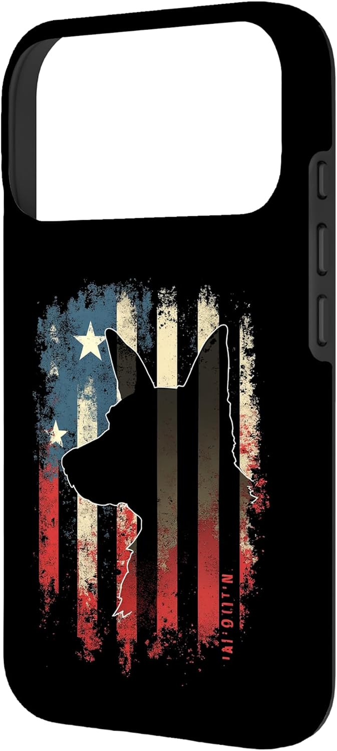 NOTION Patriotic Dog. A striking design featuring a silhouette of a dog against a rustic American flag backdrop. Ideal for patriotic dog lovers who appreciate unique and edgy art. The distressed look adds a vintage touch.