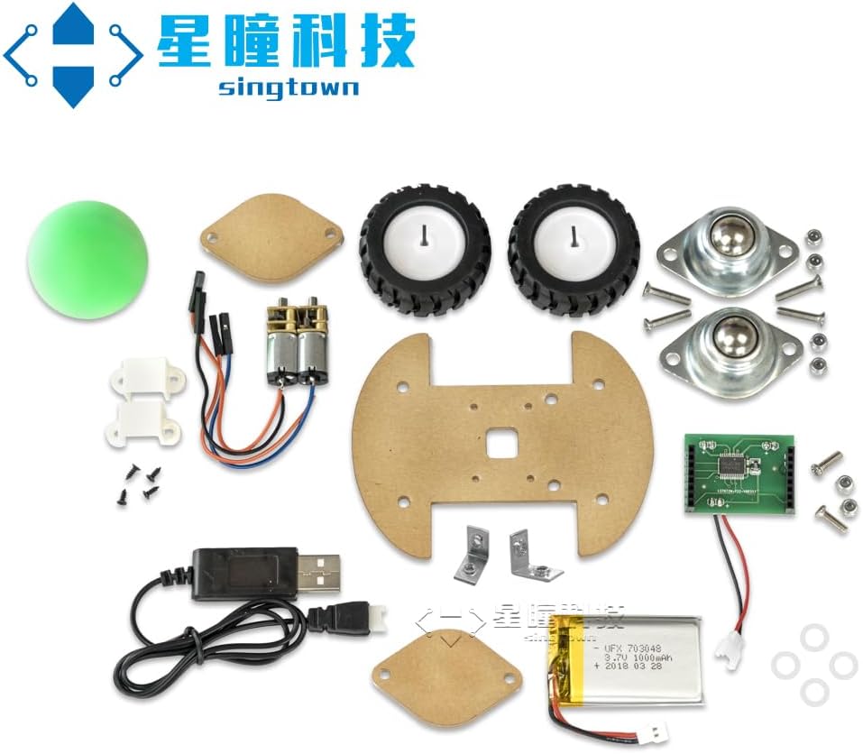 Car Chassis *1Bull's Eye Wheel *2Fixing Plate for Bull's Eye Wheel *2N20 DC Gear Motor *2Motor Mount *2Wheel *2Motor Driver Board *13.7V Li Battery *1Charging Cable for Battery *1Right Angle Fixing Plate *245° Fixing Plate *1Supporting Screws & Nuts & Gaskets *1 packet Green Ball *1