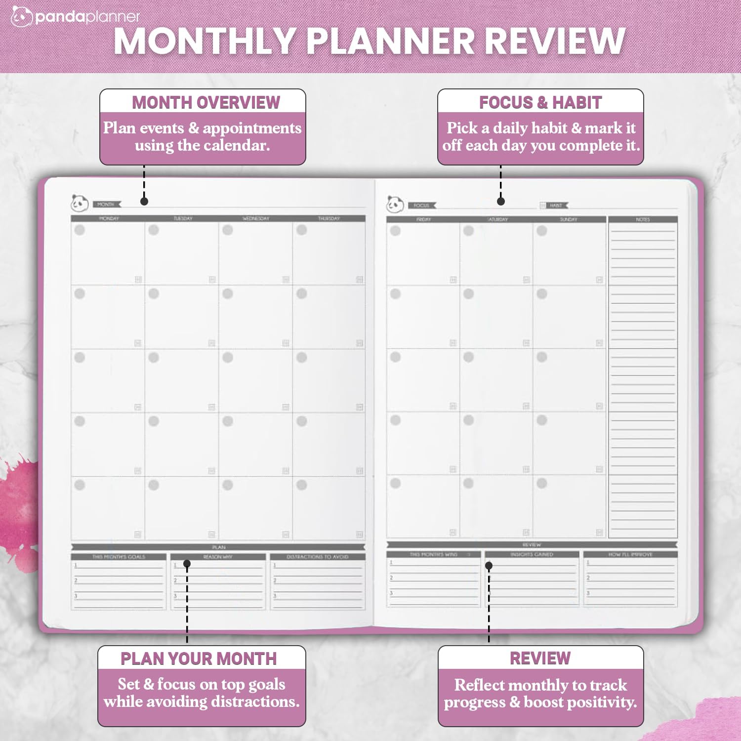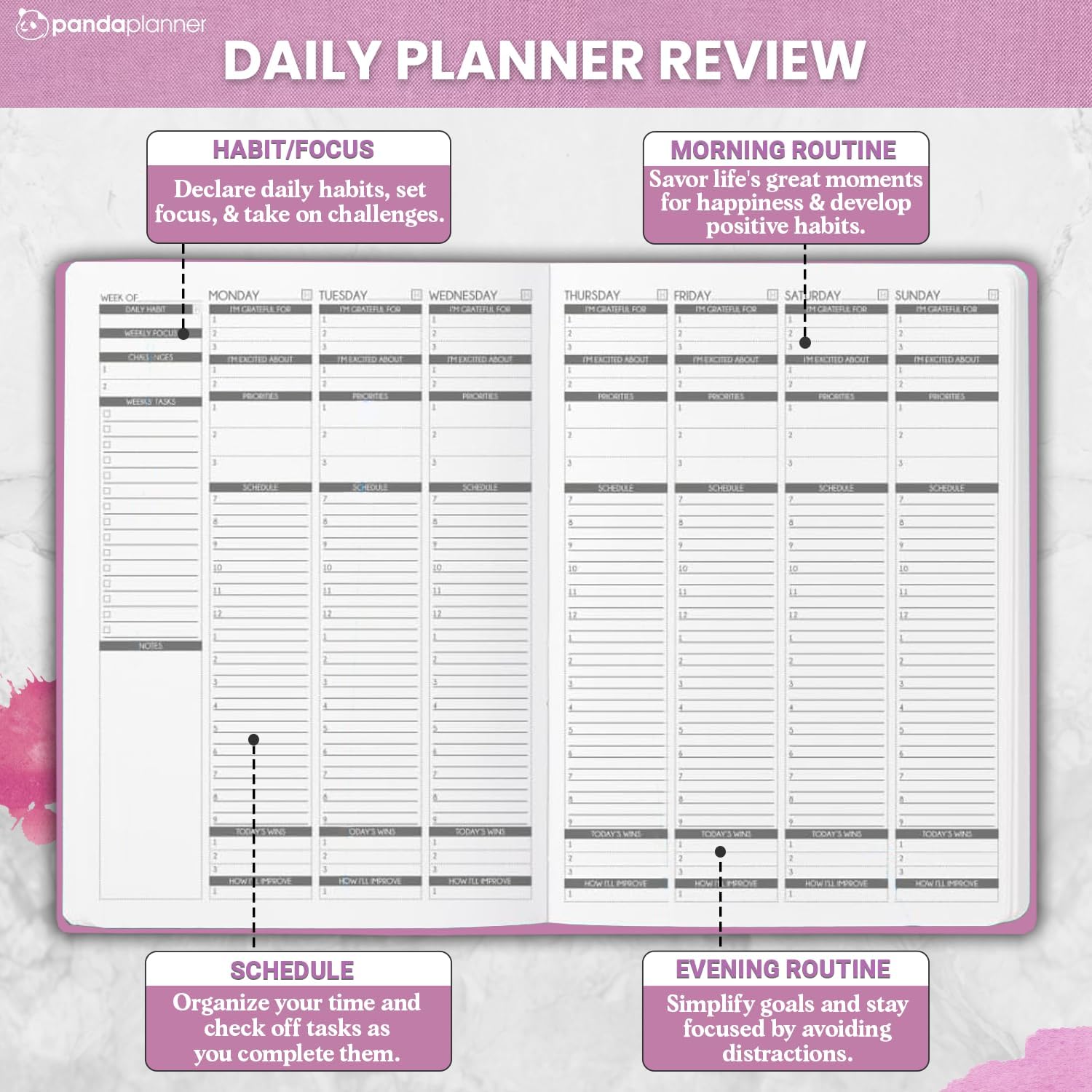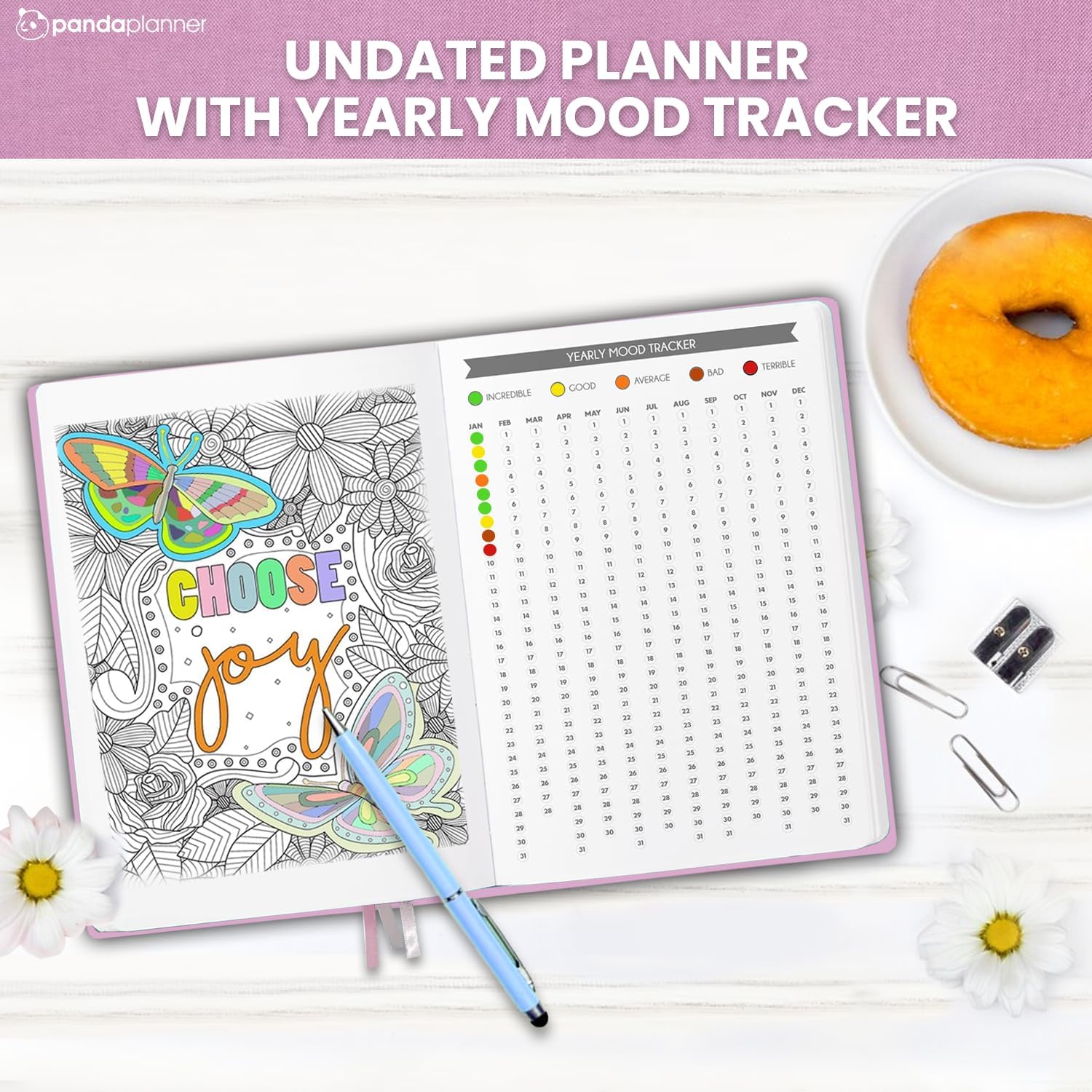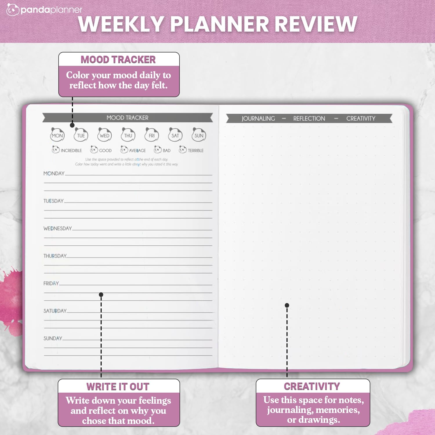 Panda Planner Mental Health Journal – 8.5” x 11" Soft Fabric Hardcover Wellness Planner with Mood Tracker & Daily Reflection Prompts – Undated 12-Month Self-Care Organizer with 3 Bookmarks (Pink)