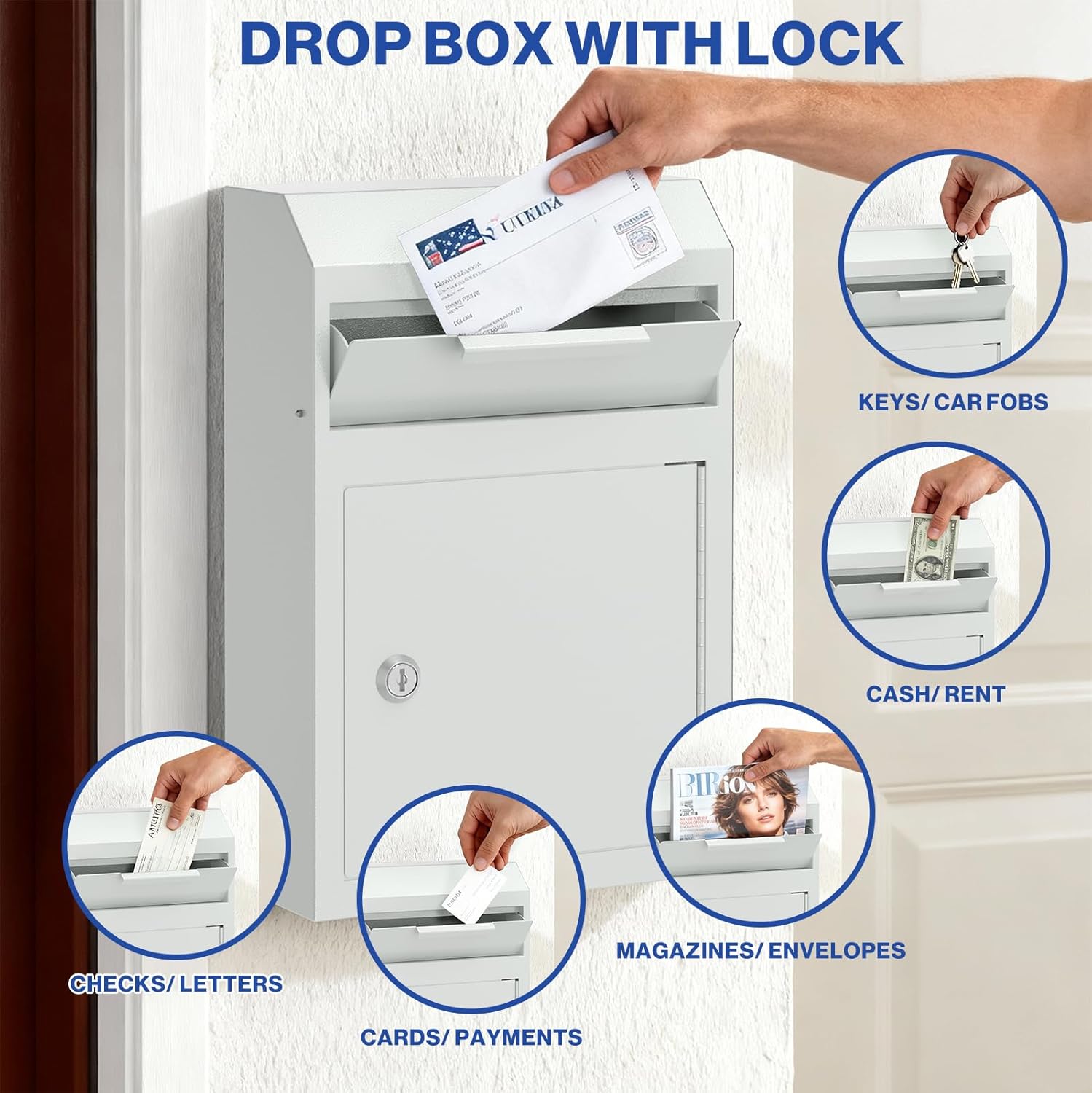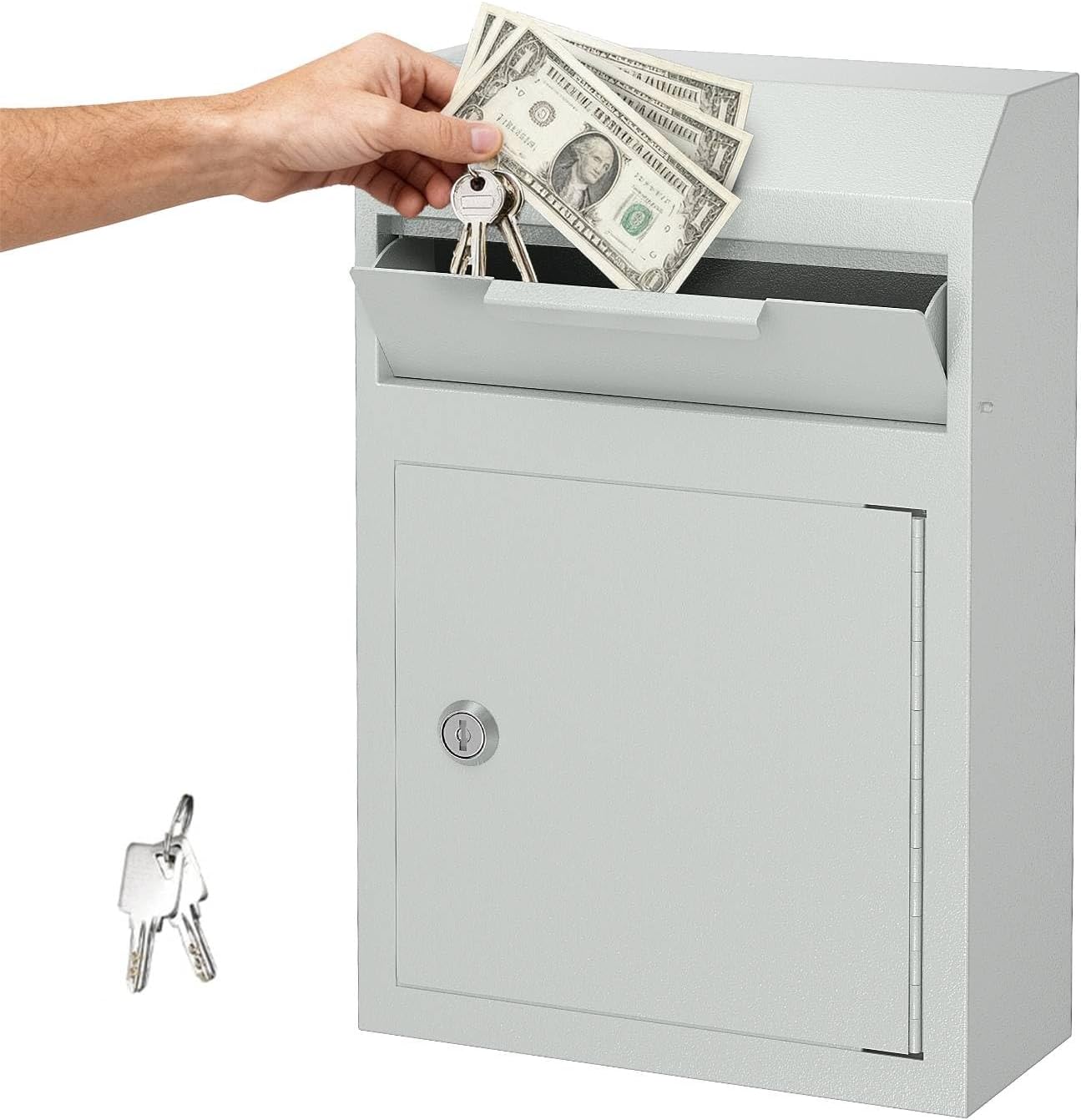 🔑FITS DAILY ITEMS: Measuring 9.8" x 14.78" x 4.2", this money drop box designed 1.1inches wide open solt and 331.5 cubic inches mail bin, can holds most daily items like keys, money, cash, mails, letters, envelopes, rents, checks, payments, car fobs, automotive keys, wallets and so on.