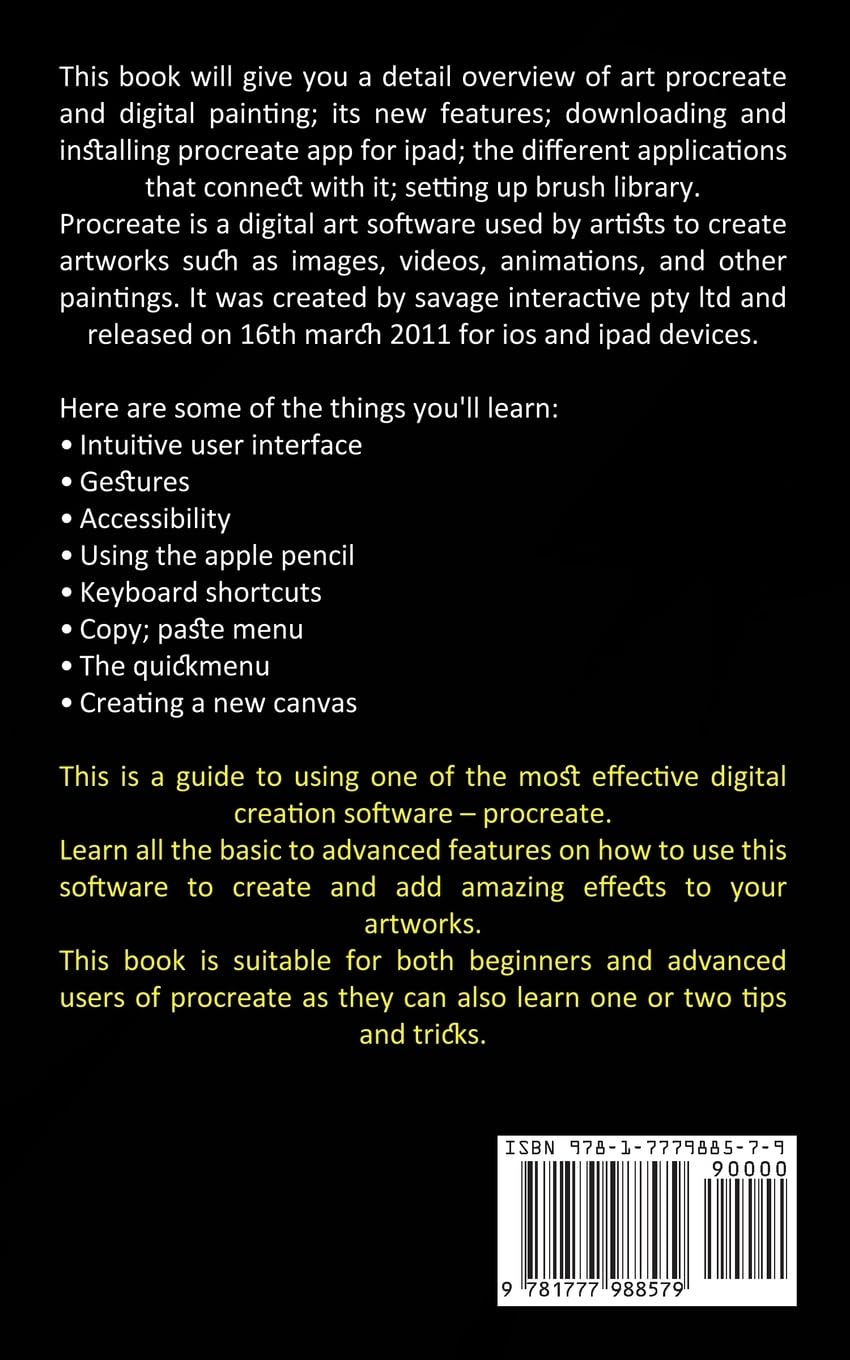 This book will give you a detail overview of art procreate and digital painting; its new features; downloading and installing procreate app for ipad; the different applications that connect with it; setting up brush library.