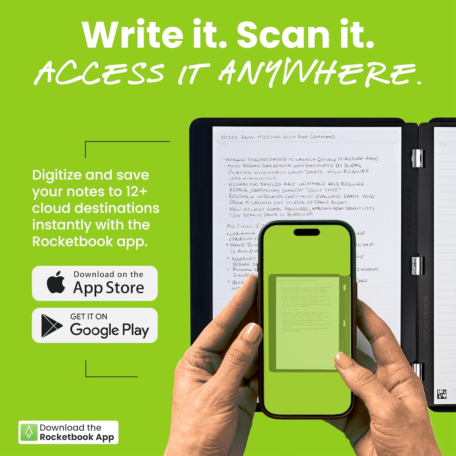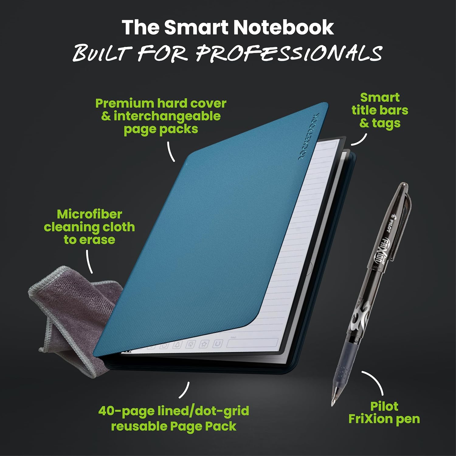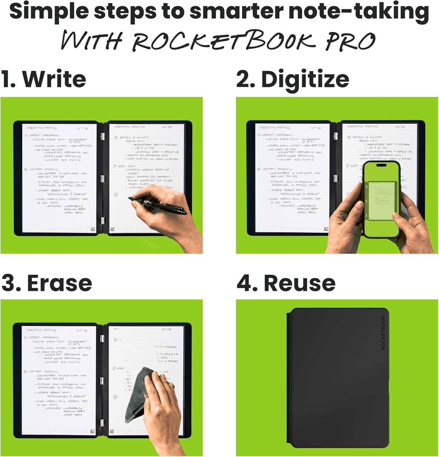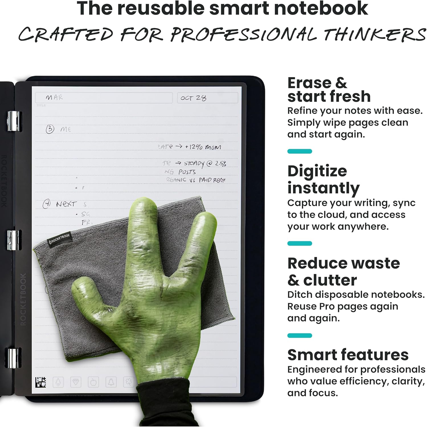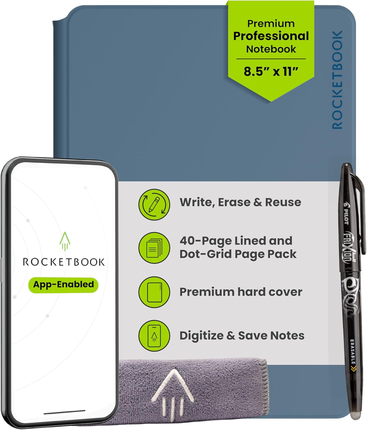 Write, Digitize, Erase, and Reuse: Write with the included FriXion erasable gel pen, scan and save your notes digitally in your cloud destination of choice with the Rocketbook app, and wipe clean with the included towel and water to reuse again and again.