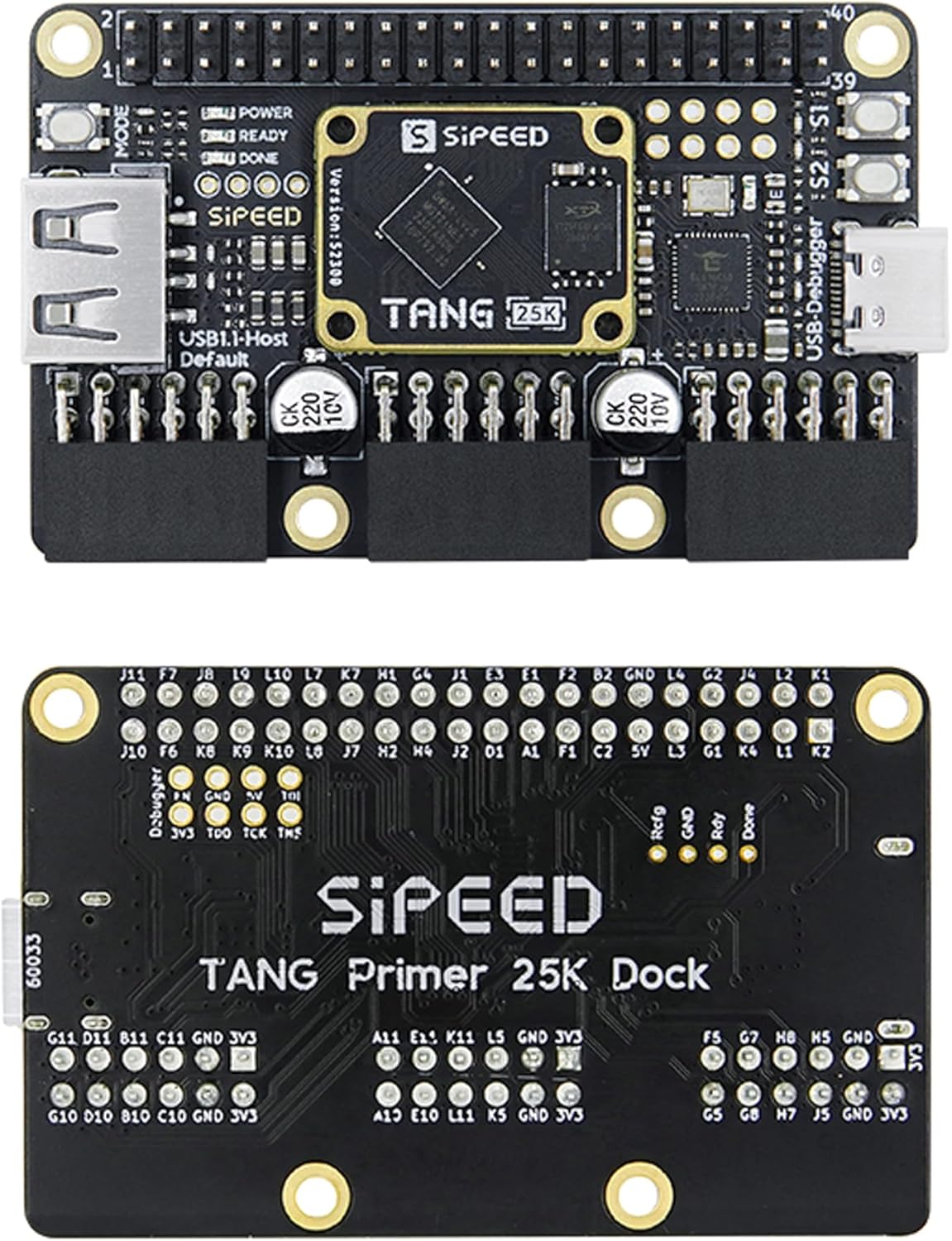 [FPGA RISCV CPU] Tang Primer 25K Dock single board computer is a new generation of modular development board with onboard RISC-V soft core, 23K LUT4 FPGA GW5A RISCV CPU, supports MIPI 2.5Gbps Ethernet, and is equipped with a USB-JTAG debugger , 3x PMOD interface, 1x USB interface and 1x 40P pin header interface to facilitate FPGA programming.