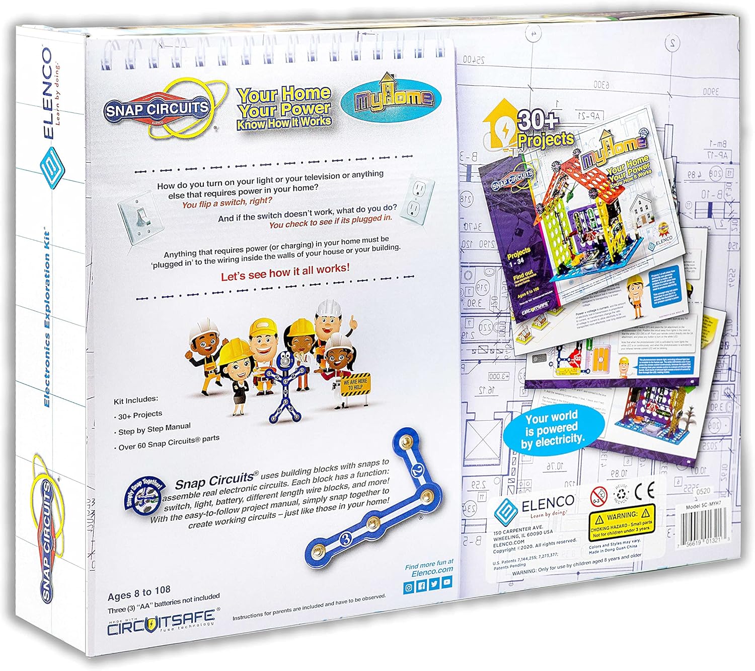 Build 34 exciting STEM projects that are based on electric circuits you would find in most homes. Learn how power gets to your home, how power travels inside your walls, what happen when you turn on a light, what happens when the power goes out, what are fuses, circuits breakers, and more! Use the color and number coded building blocks with snaps to build and understand electrical circuits, home security, overhead lights, dependent and independent lights, and even an infrared controlled lighting system. This STEM learning toy contains 60 parts including a base grid, slide and press switches, vertical, snap and jumper wires, battery holder, resistors, capacitor, LED's, lamp, sound module, transistors, a meter, a motor, detailed instructions, and more! (Requires 3 AA alkaline batteries, sold separately). No glue or tools required. Elenco Snap Circuits My Home Electronics Building Kit teaches the fundamentals of electricity and electric circuits building electronic circuits and how they interact with various green energy technologies. Snap Circuits unique technology uses building blocks with snaps to build the different electrical and electronic circuits. Each block has a function: there are switch blocks, light blocks, battery blocks, different length wire blocks, etc. These blocks are colored and numbered to make them easy to identify during the building process. Kids will have hours of fun creating up to 34 different circuit projects and learning about how electricity powers our everyday lives. The color-coded, detailed instruction sheets provide step-by-step directions on each project, making learning both easy and fun. In this electronic building set, kids will learn about electricity, building circuits, and how power flows through our homes. Ages 8 years and up Elenco's Snap Circuits makes learning electronics easy, educational, and fun! They are endorsed by educators worldwide and used in schools, libraries, museums, and STEM educational programs. Snap Circuit’s patented Circuit Safe technology is unique to Snap Circuits branded products, makes learning circuitry safe. Snap Circuits products are well known for their commitment to education have won many awards, including Toy of the Year (TOTY), ASTRA'S Best Toys for Kids, Parent's Choice Recommended, Good Housekeeping's Best Toy, Family Choice, National Parenting Publications Awards (NAPPA Gold), Children's Choice, Dr. Toy (100 Best Children's Products, 10 best Educational Products, Green Toy Company), KAPi Award, and the inaugural Seriously STEM Award.