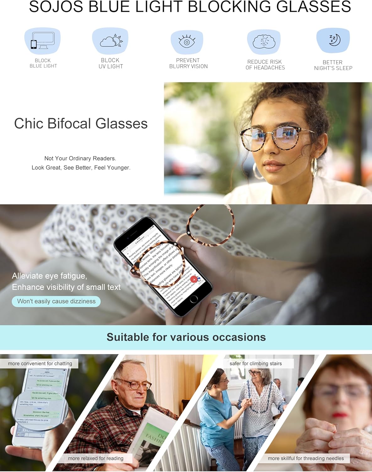 The video showcases the product in use.The video guides you through product setup.The video compares multiple products.The video shows the product being unpacked. SOJOS SJ9001 Blue Light Reading Glasses Merchant Video