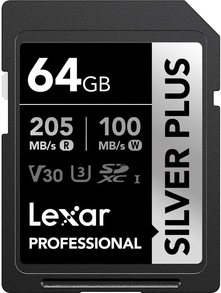 The Silver Plus 64GB UHS-I SDXC takes advantage of the UHS-I bus to support Full HD and 4K/60p video. It is also well suited for continuous shutter bursts, rapid shooting, and raw and JPEG captures. It achieves maximum read speeds of up to 205 MB/s and maximum write speeds of up to 100 MB/s.