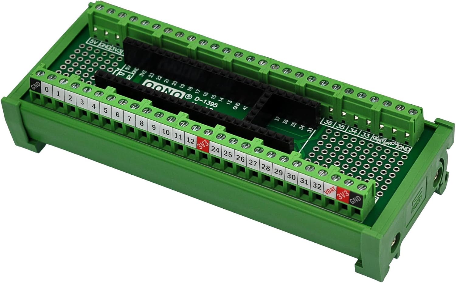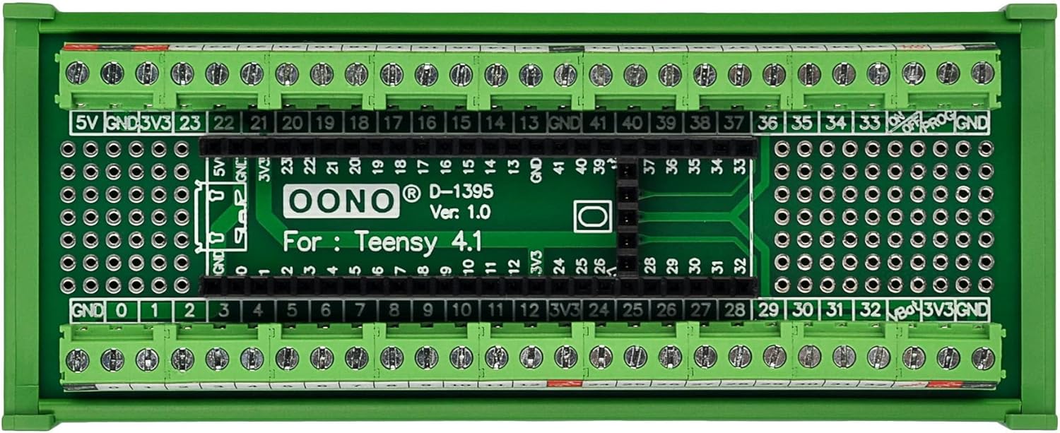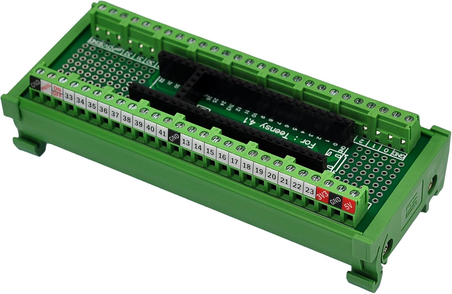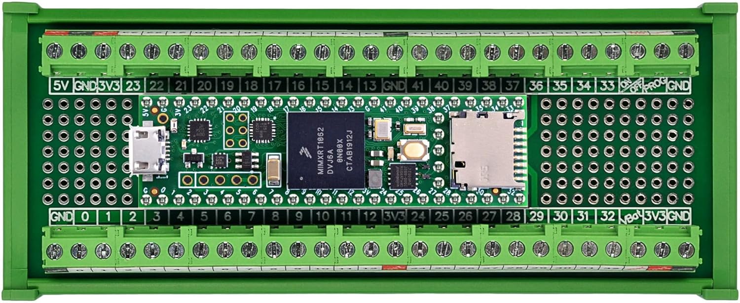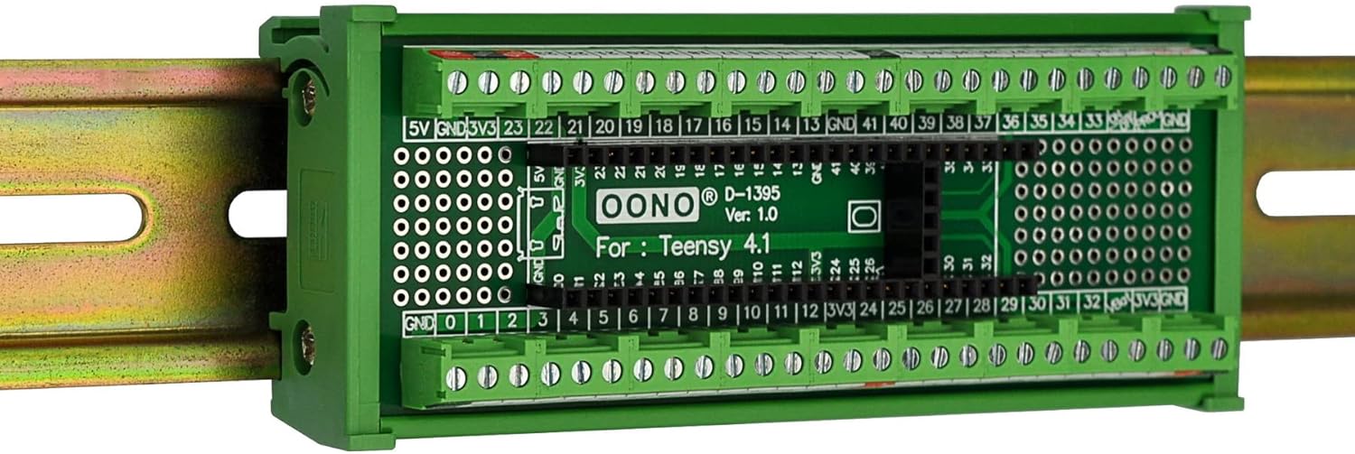 Terminal Block Breakout Board Module for Teensy 4.1, DIN Rail Mount Version. With the breakout board, you can easily extend Teensy 4.1 projects to industrial control, home automation or other applications.