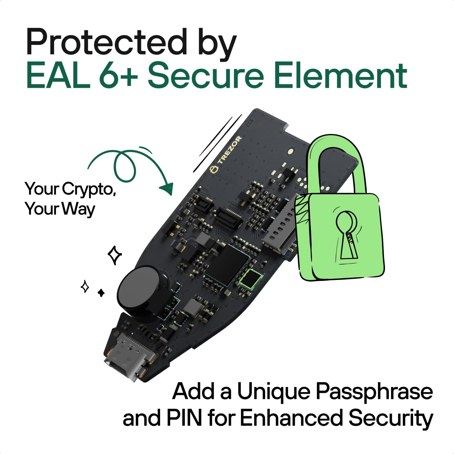 Introducing the new Trezor Safe 5 hardware wallet! Equipped with a vibrant color touchscreen and haptic feedback, it offers effortless navigation and secure asset management. Safeguarded by an NDA-free EAL6+ certified Secure Element, it shields your crypto from both online and offline threats.