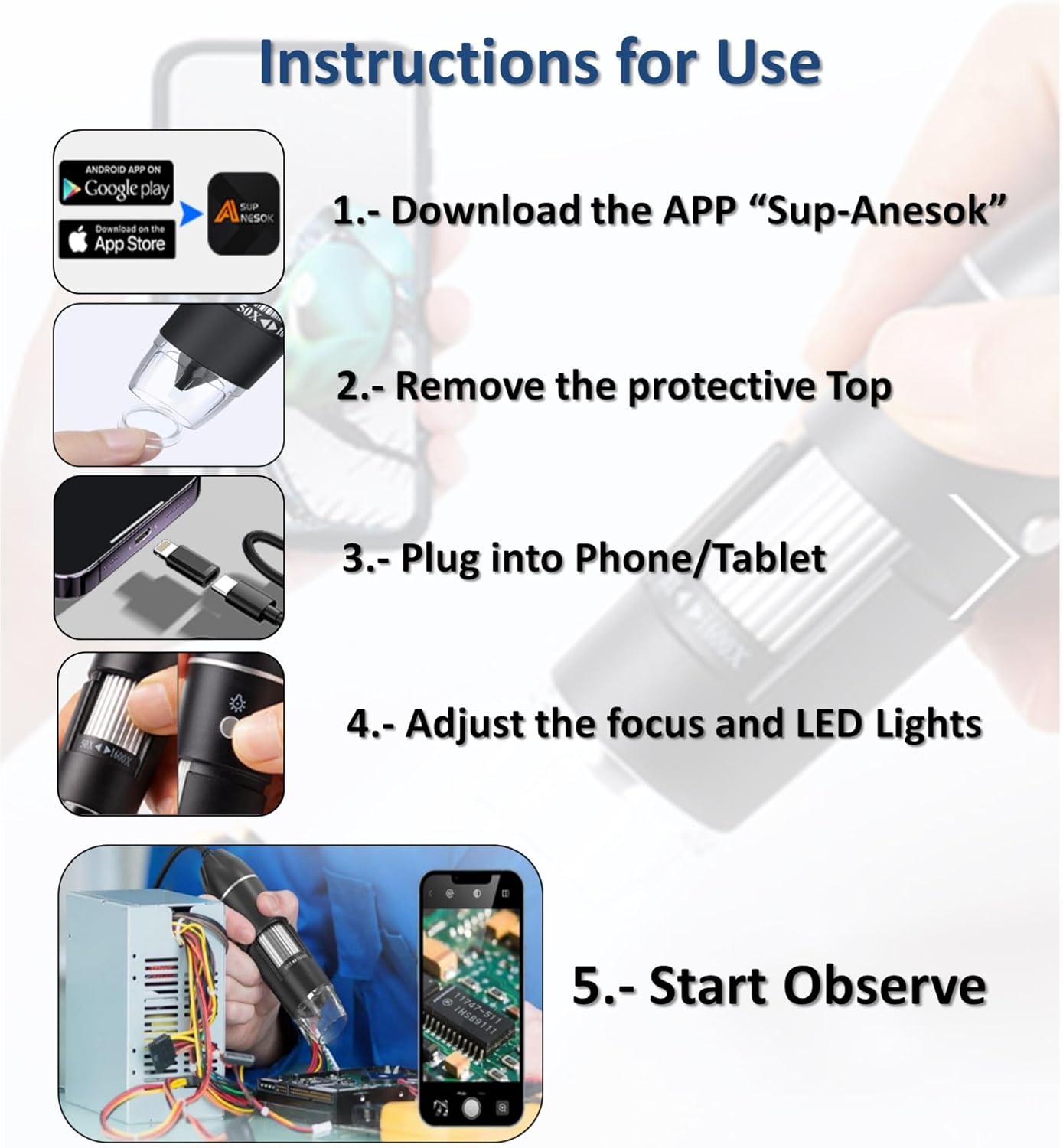 What's Included & Support: You'll receive the USB Digital Microscope, a 4.92FT USB Type-C Cable (plus Lightning & Micro-USB adapters), and a User Manual. For optimal image quality, a steady hand is recommended. Our customer support team is always ready to assist