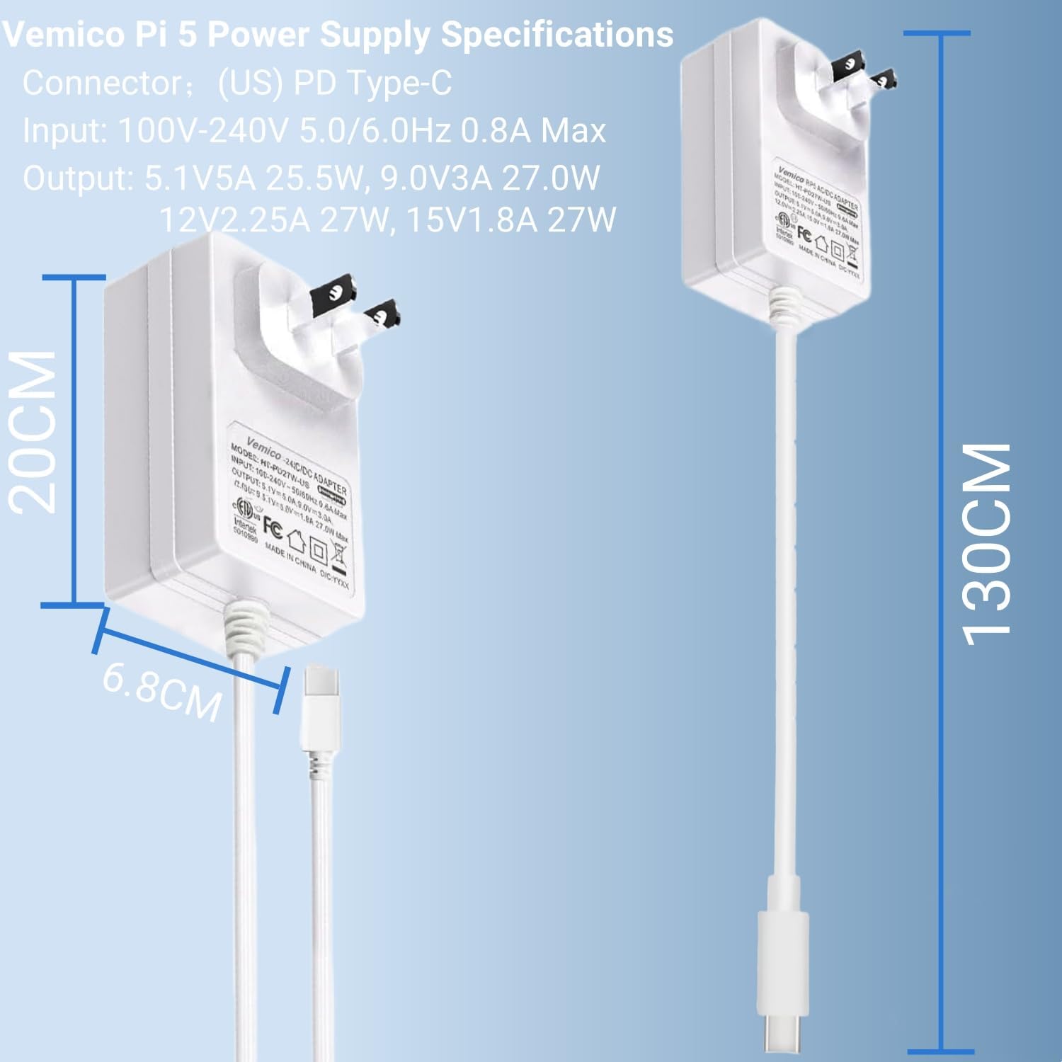 Vemico 27W Type-C power adapter for Raspberry Pi 5 support 5.1V5A power for Pi 5/Pi4/Pi3 B+/Pi.