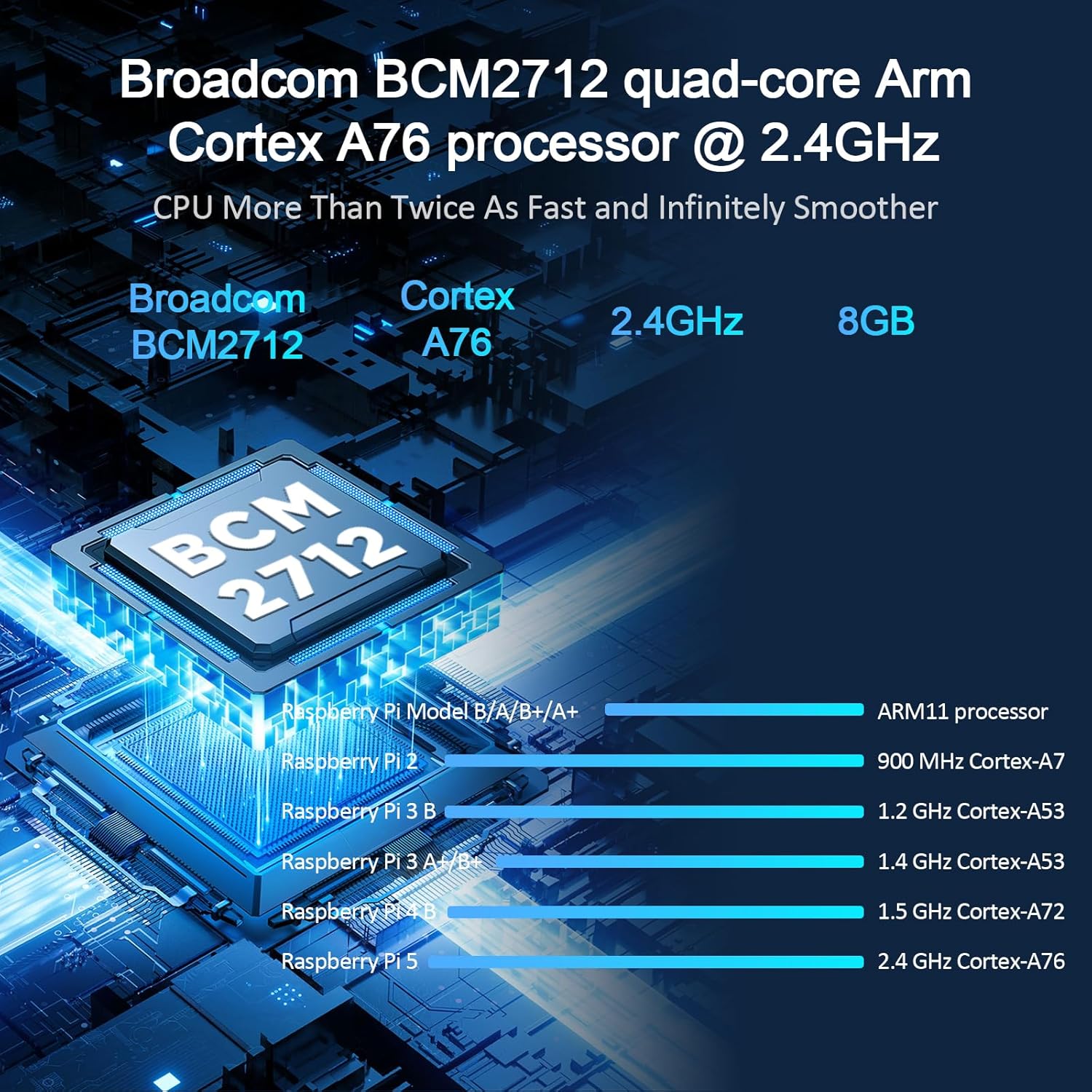 【Latest Raspberry Pi 5 8GB Board】Raspberry Pi 5 Board features a Broadcom BCM2712 64-bit quad-core Arm Cortex-A76 processor running at 2.4GHz, Pi 5 delivers a 2-3× increase in CPU performance relative to Pi 4. With a substantial uplift in graphics performance from an 800MHz VideoCore VII GPU; Dual 4Kp60 display output over Micro HD Out; State-of-the-art camera support from a rearchitected RPi Image Signal Processor, it provides a smooth desktop experience for you.