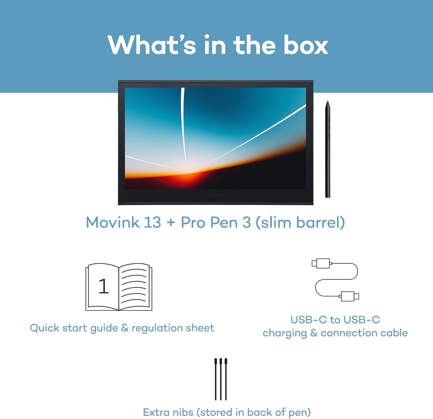 Includes: Movink 13 digital drawing pad, Pro Pen 3, USB-C cable for connectivity and charging (1m), Nib holder with 3 replacement Nibs (1 standard, 2 felt), Nib remover, quick start guide, and professional software trials