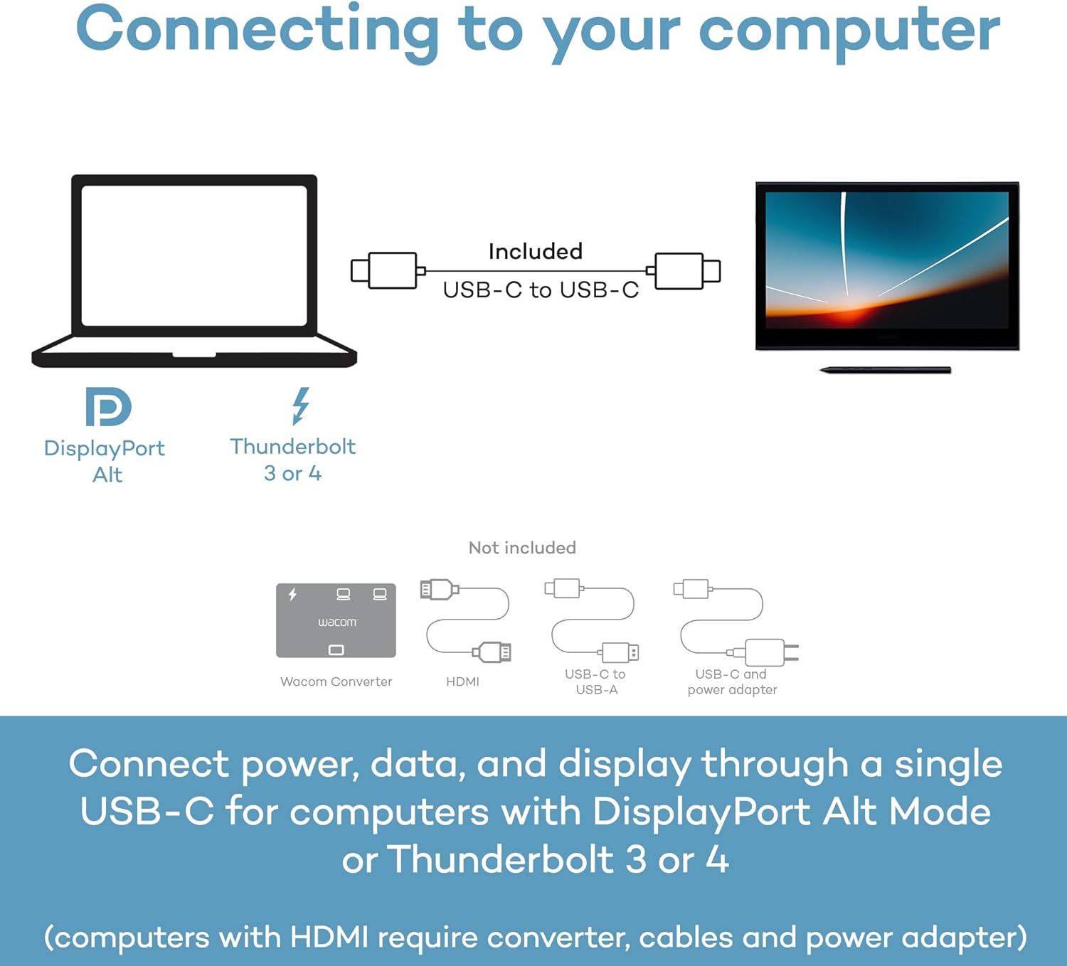 Wacom Movink connects to Windows, Mac, or Chromebook with a single USB-C cable that delivers power, video, and pen data - no clutter, no hassle. Most modern laptops with USB-C (Thunderbolt 3/4 or DisplayPort Alt Mode) work right out of the box with the included cable. We included only the most universally compatible USB-C cable to help reduce e-waste - since most users won’t need anything else to start creating. For HDMI connections, the Wacom Converter (ACK45219Z) is required, along with HDMI and USB cables and a power adapter.