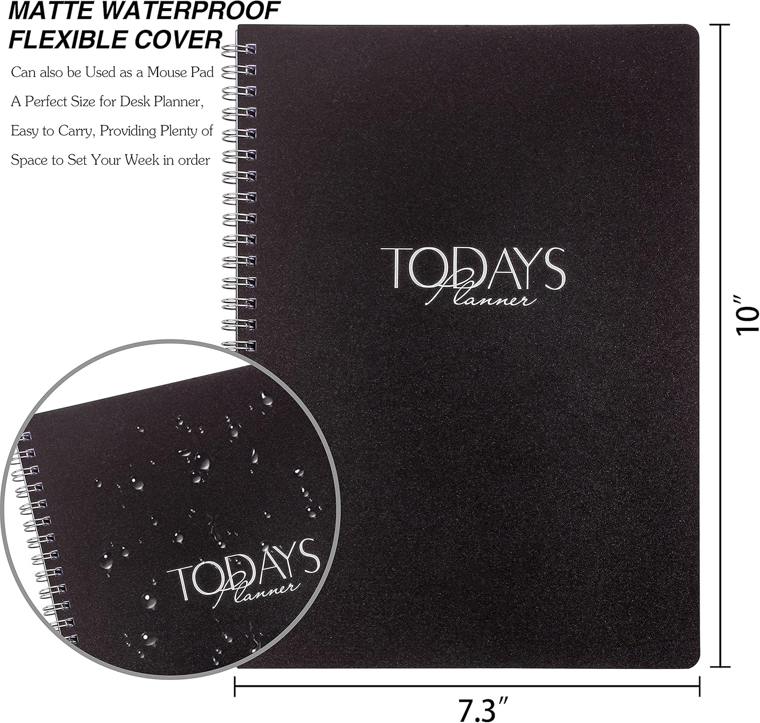 PORTABLE SIZE with DURABLE SPIRAL BINDING: This weekly spiral notebook size of 10 x 7.3 inches, fits perfectly in bag, desk. Generous size has just right size to cover everything you need to plan for the day. Durable spiral binding allows freely page turning without page jam and avoid the falling off of pages.