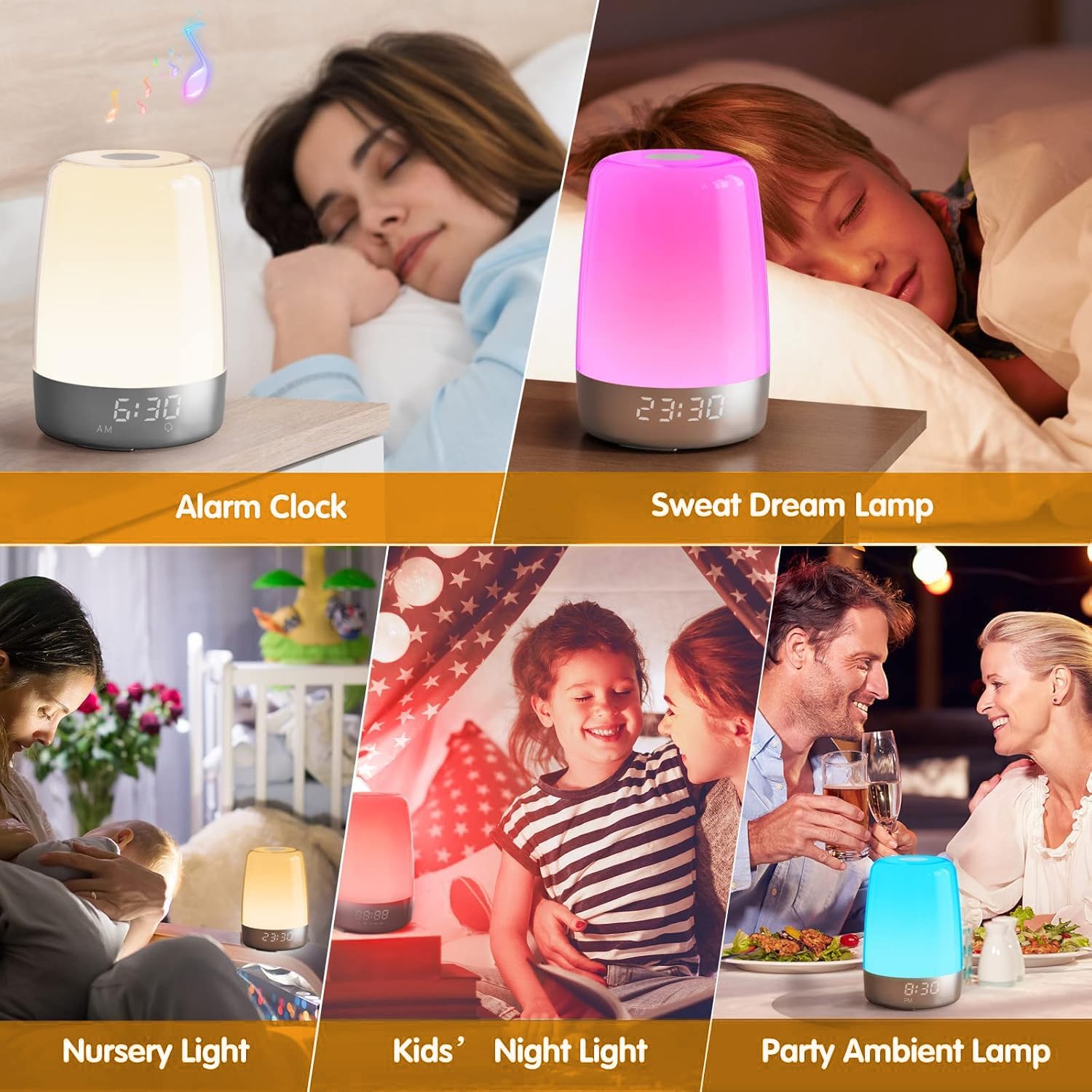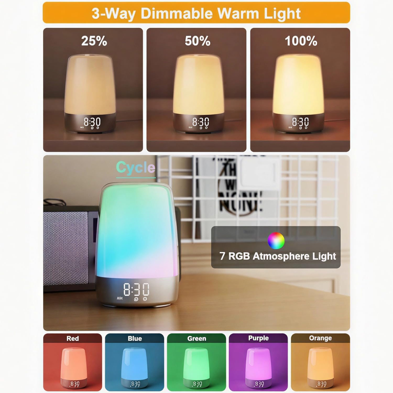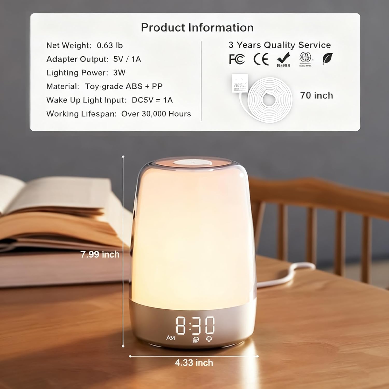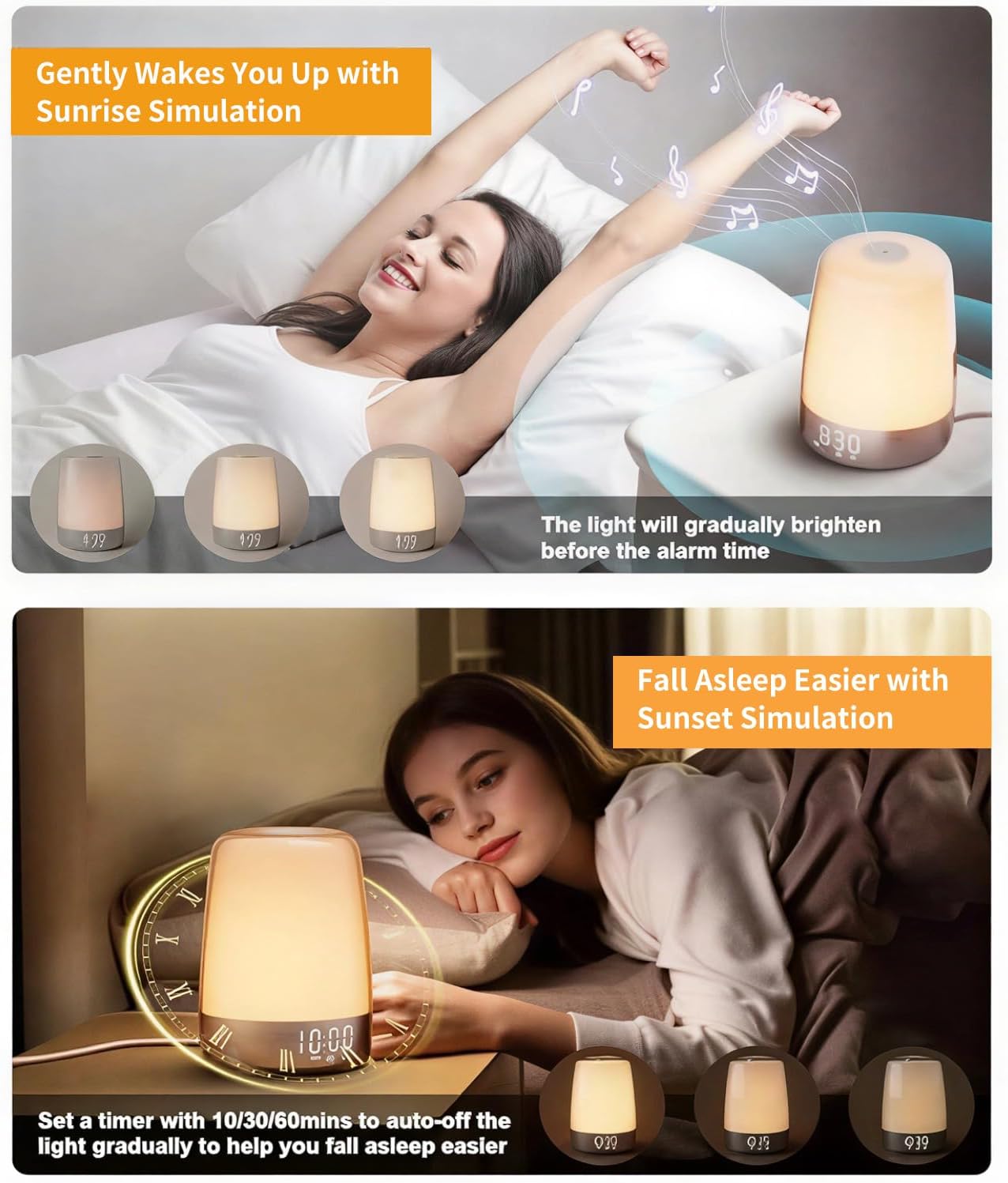 Wake up sunrise alarm clock with sleep aid feature: Try to wake up smooth by the light that changed from dark to soft warm white, and then it alarms. It allows the human body to be a wake up naturally in 30mins that much better than the traditional alarm mode of waking up suddenly. Making you refreshed in the morning, as well it can be scheduled 10/30/60mins before the asleep to turn from bright to the dark light, children can also feel company, no longer afraid of falling asleep alone.