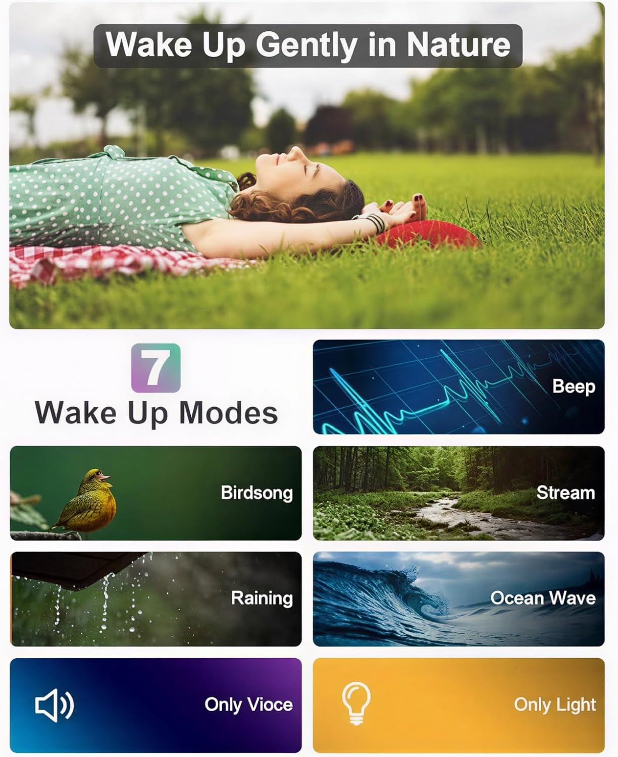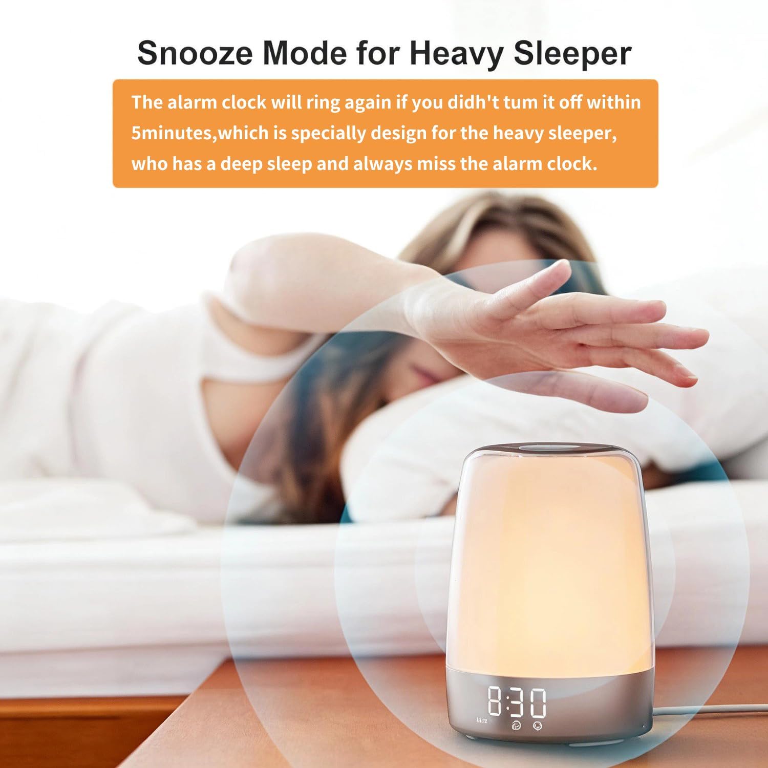 Bedside lamp alarm clock for heavy sleepers: Snooze mode Intimately designed to relieve worries in the morning, if you do not manually turn off the alarm in five minutes after the ring, the alarm will automatically restart after the next five minutes. As well you can choose your favorite voice from 5 nature sounds.