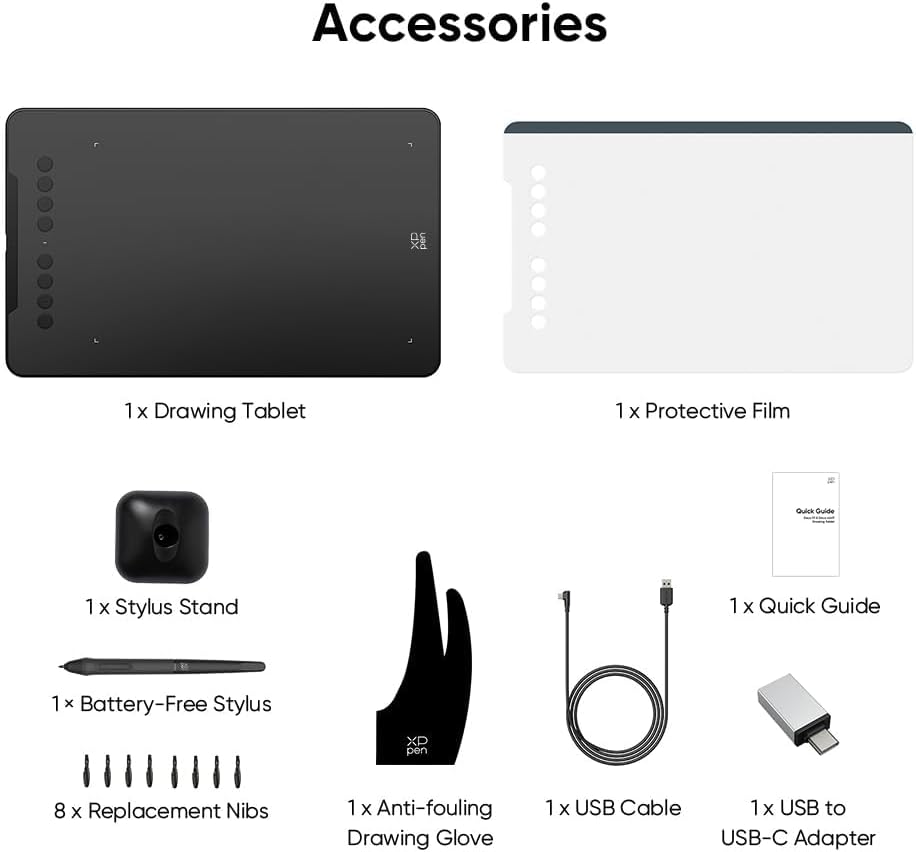 What You Get: 1 x Deco 01 V3 Drawing Tablet, 1 x Stylus, 10 x Nibs, 1 x Stylus Stand, 1 x Glove, 1 x Protective Film, 1 x USB-C to USB-A Cable, 1 x USB to USB-C Adapter