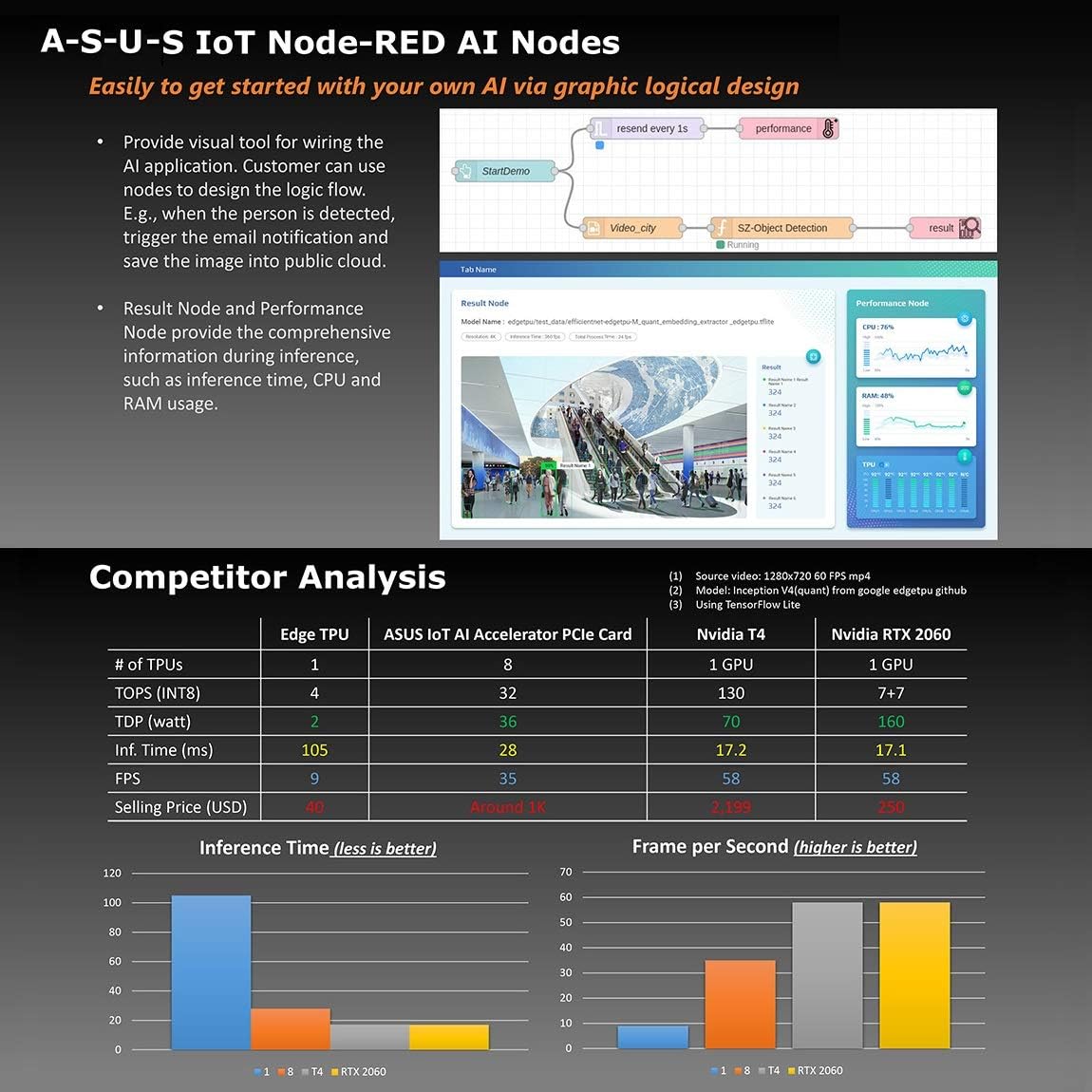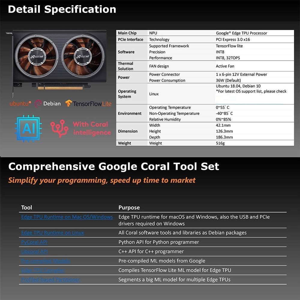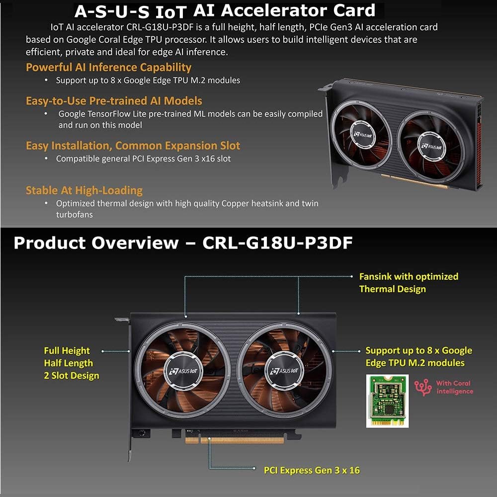 AI accelerator card PCIe Gen3 based on Google Coral Edge TPU processor, enabling AI-based real-time decision process at edge. ASIC design for AI inference acceleration Multiple AI analytics run in parallel AI-model-pipelining technology to achieve low latency Low power consumption of just 36-52 watts 8 Edge TPU, support 32TOPS model: CRL-G18U-P3DF